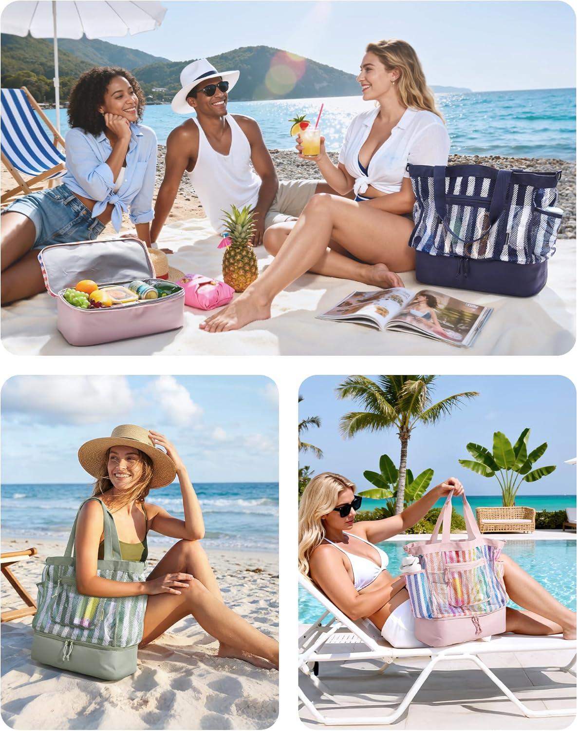 BAGSMART Beach Bag for Women, Mesh Tote Bags with Zipper, Sandproof Vacation Essentials with Cooler for Swim Cruise Pool(Green)