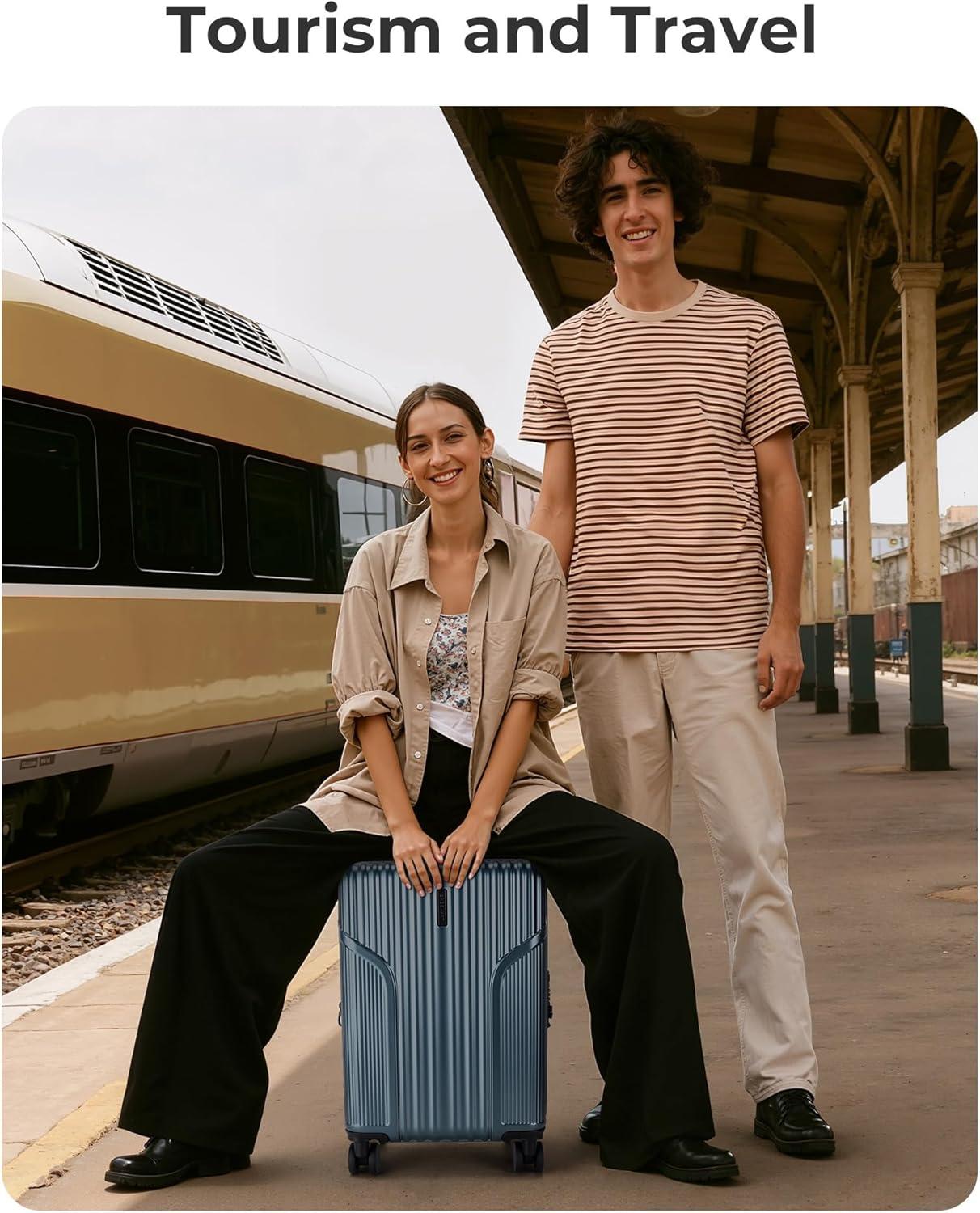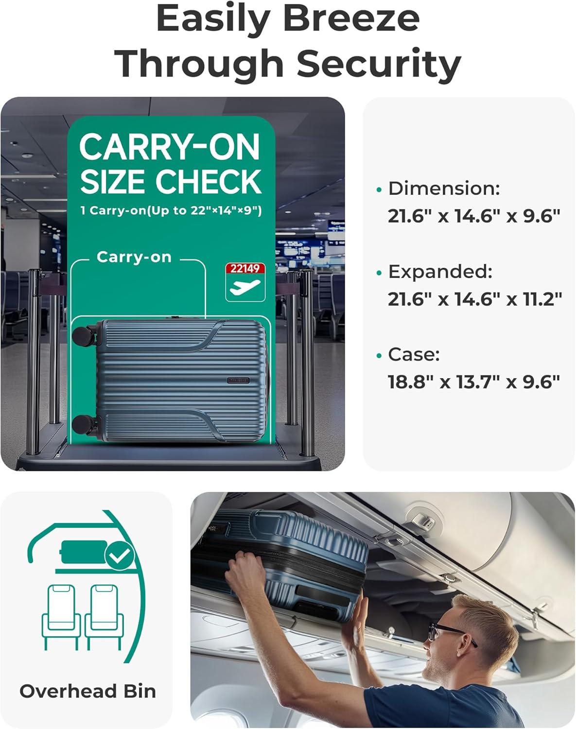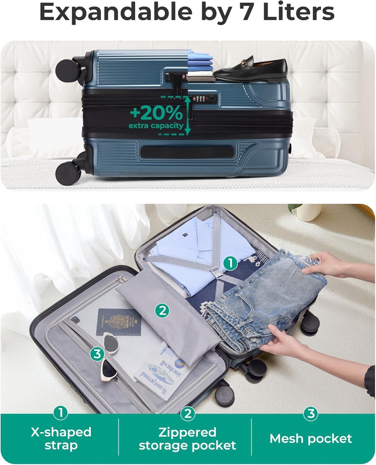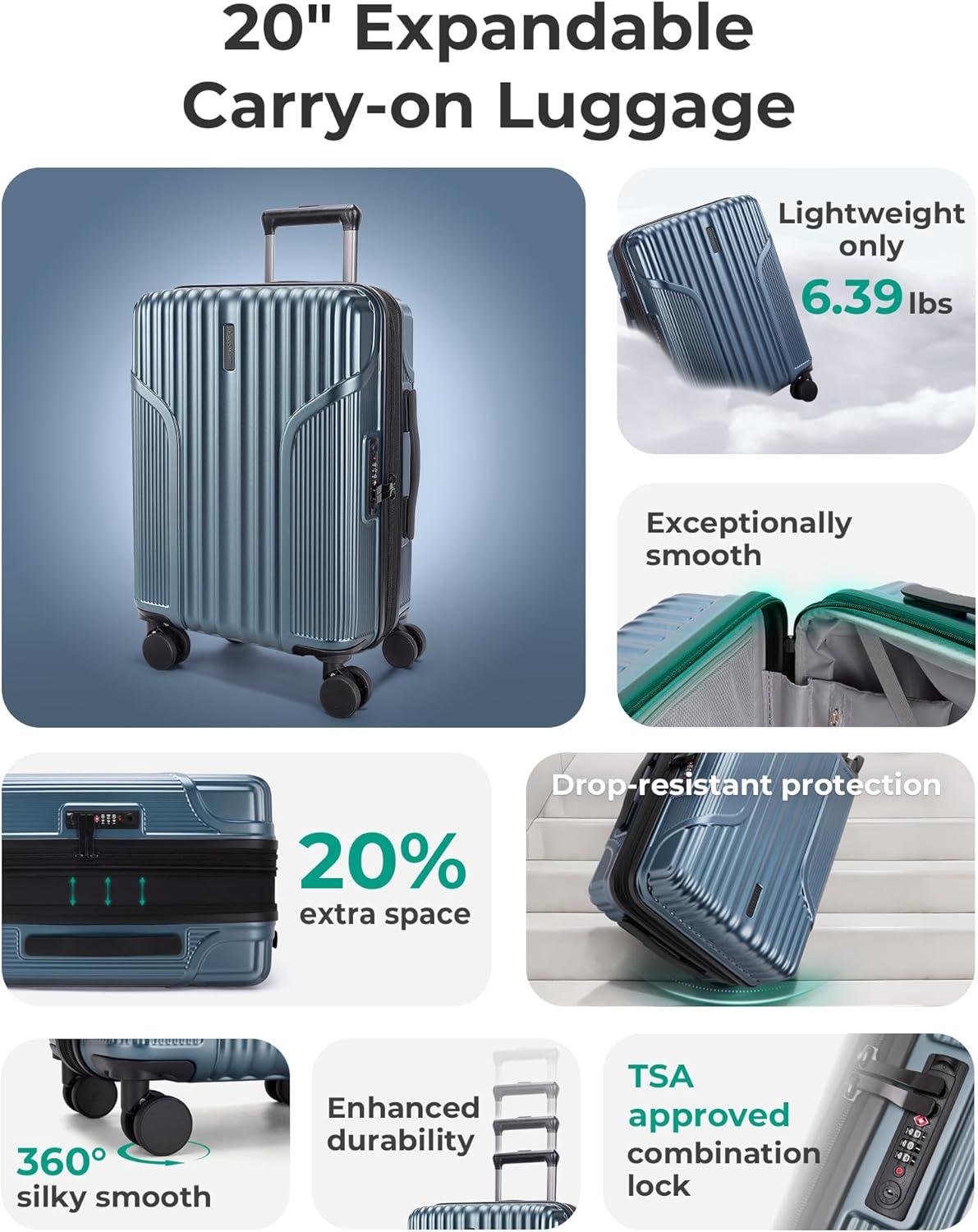 BAGSMART Expandable Carry On Luggage 22x14x9 Airline Approved, 1OO% PC Lightweight Hard Shell Suitcase, 20 Inch Travel Luggage with Spinner Wheels, Waterproof Rolling Suitcase,Blue(Airy Blue)