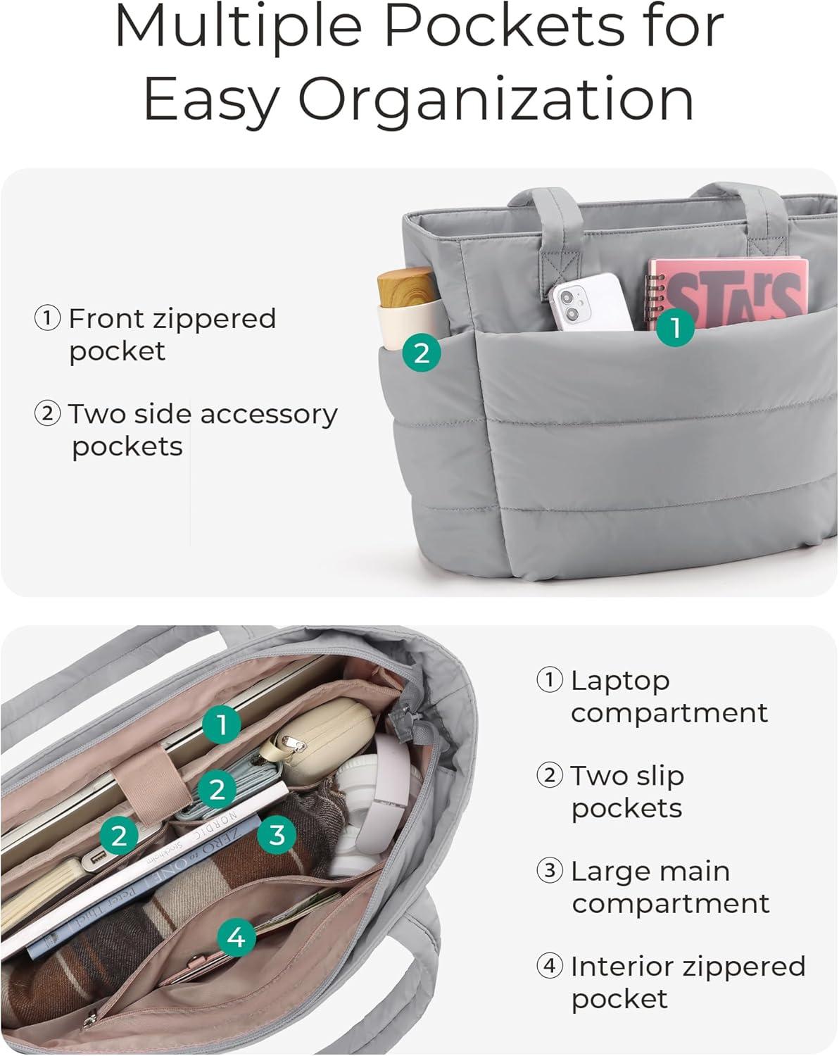 BAGSMART Tote Bag for Women, Lightweight Puffy Tote Bag with Compartments Shoulder Bag Handbag for Travel, Work, Gym | Lightweight, Puffy, Tote Bag with Compartments, Quilted, for Travel, Work(Light Gray)