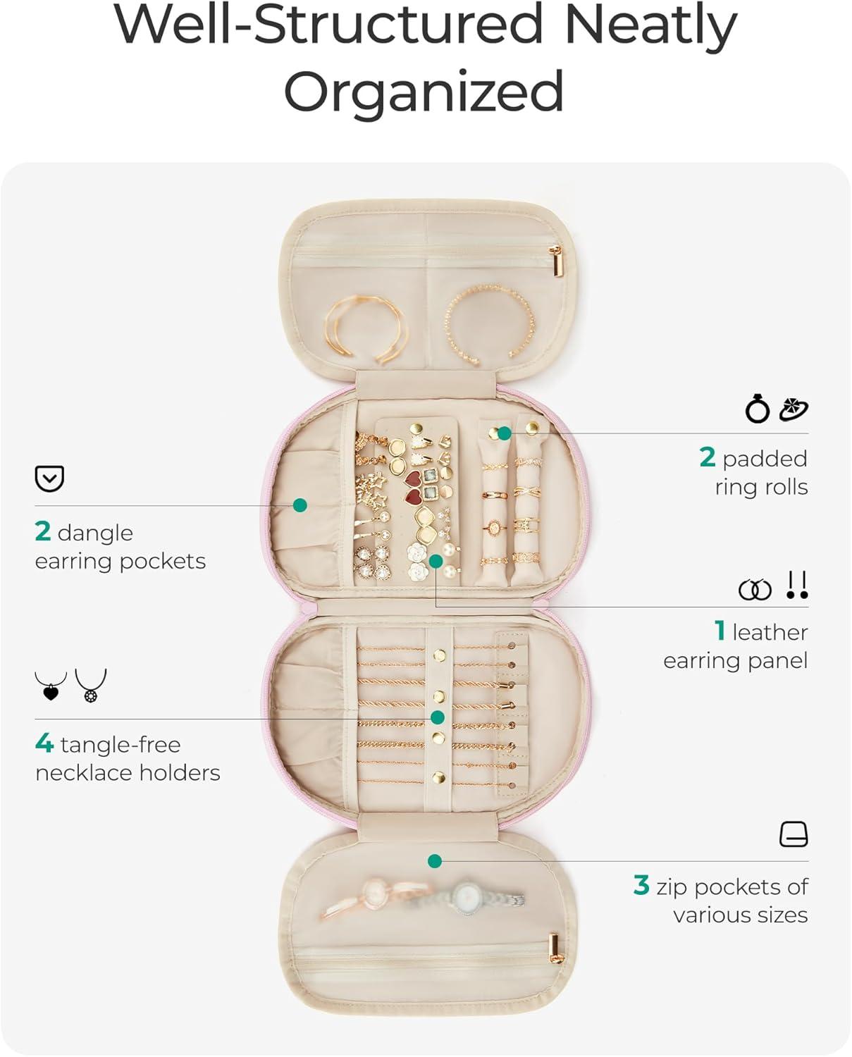 BAGSMART Travel Jewelry Case Jewelry Organizer Storage Roll Rings Necklaces Earrings Bracelets Brooches Watch Large Portable Light Pink(A-Beige)
