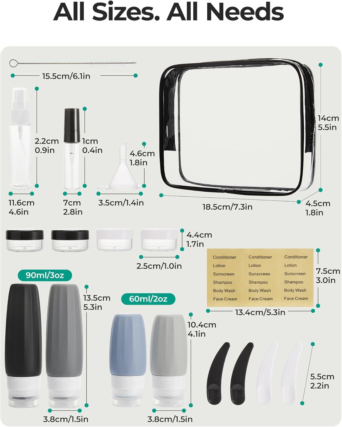 ๐๐จ๐ฎ๐ซ ๐๐ฅ๐ฅ-๐ข๐ง-๐จ๐ง๐ ๐๐ซ๐๐ฏ๐๐ฅ ๐๐ข๐ญ ๐๐จ๐ง๐ญ๐๐ข๐ง๐ฌ: A clear bag keeps all items organized. TSA Approved travel bottle includes 4 leak-proof silicone bottles (2pcs 3oz/2pcs 2oz), 2 sprayers, 4 jars, labels, a cleaning brush, 4 spoons, and a funnel