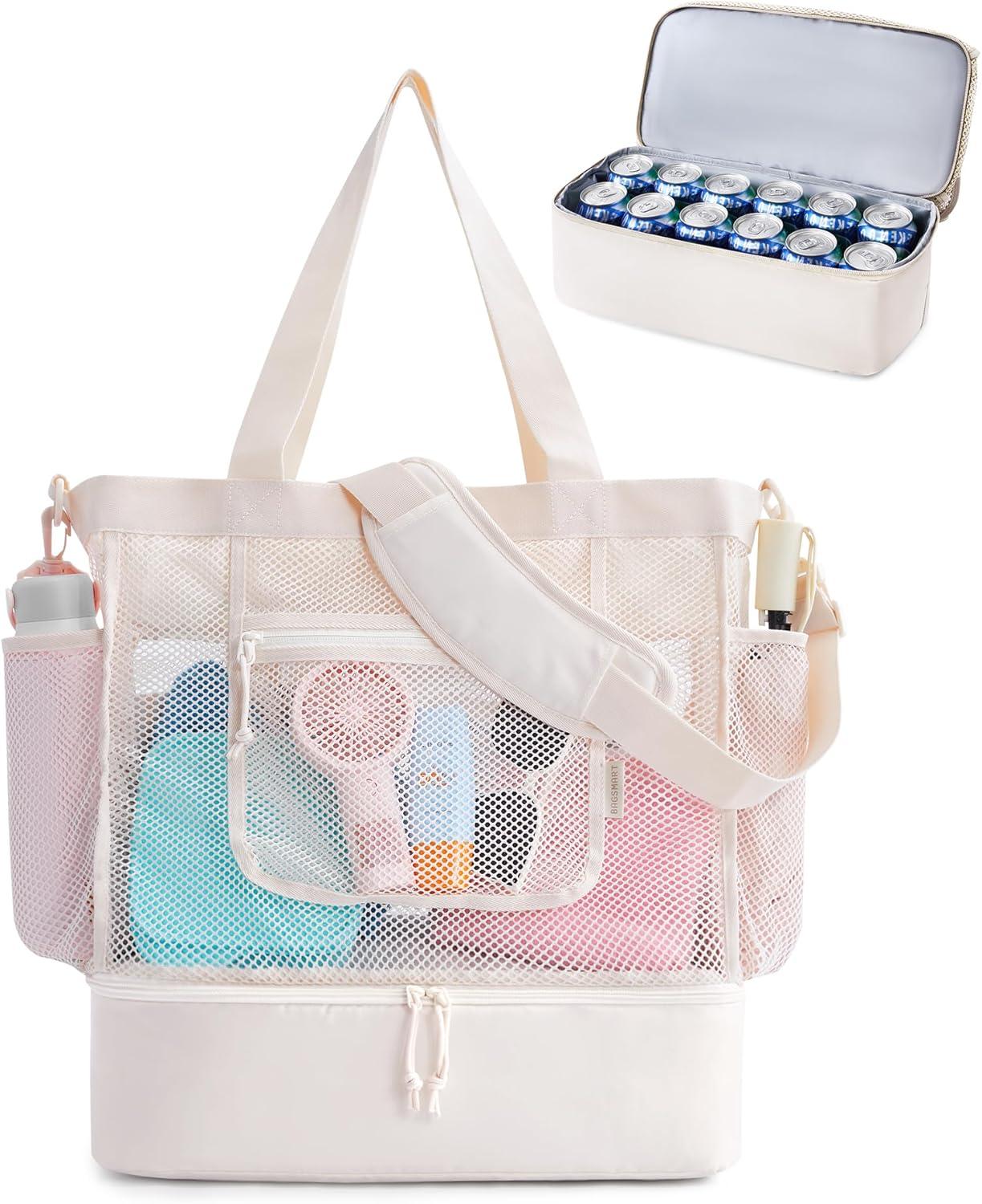 BAGSMART Beach Bag for Women, Mesh Tote Bags with Zipper, Sandproof Vacation Essentials with Cooler for Swim Cruise Pool(Beige)