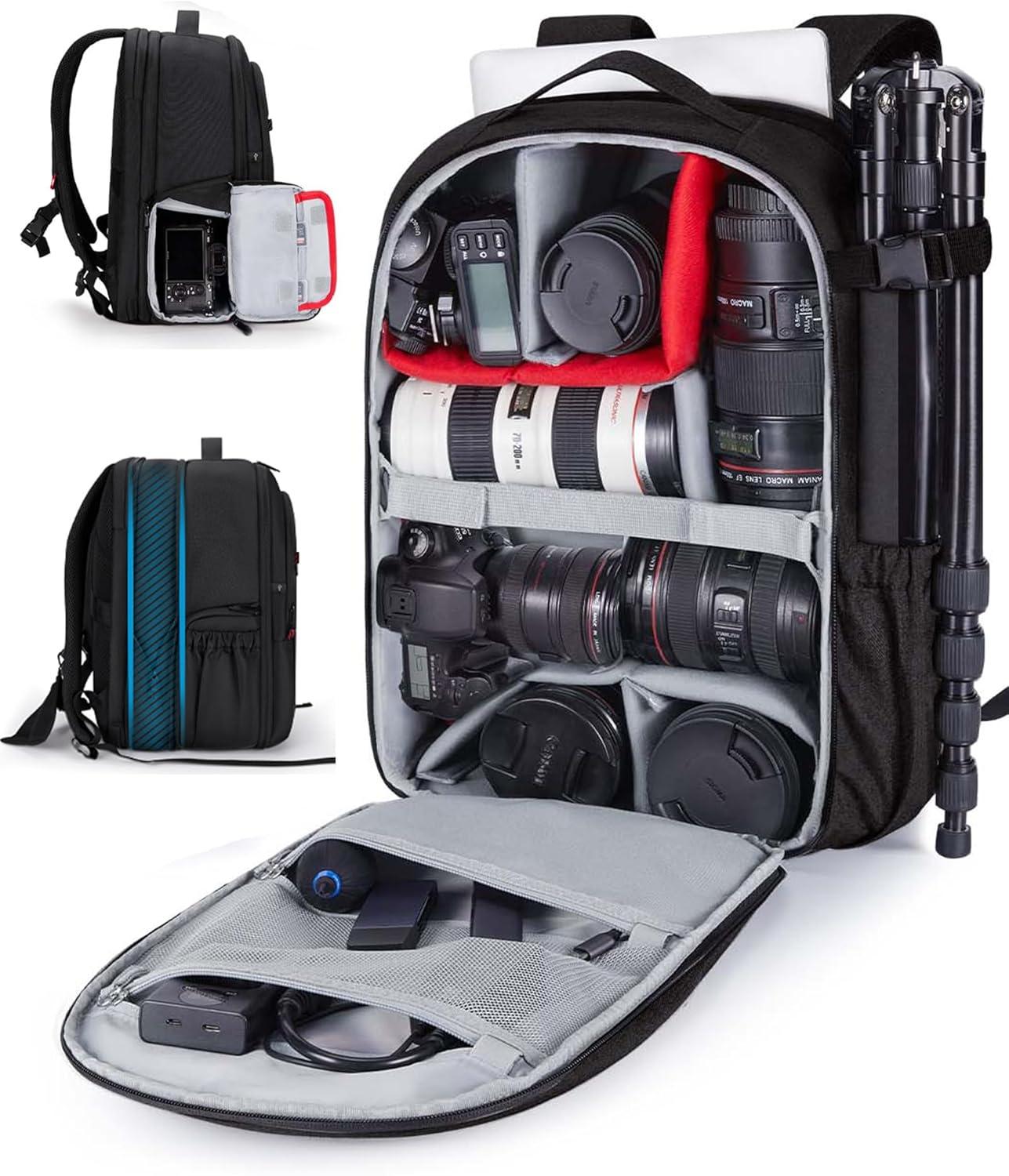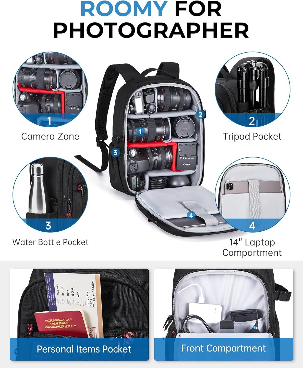 THOUGHTFUL DESIGNS: It features a accessories mesh pocket for quick store the lens cap or other small items, one charging hole in the front compartment for easy charging of electronic devices, 2 side pockets for a water bottle or whatever you need easy access to, and the water-resistant fabric with a rain cover for moisture