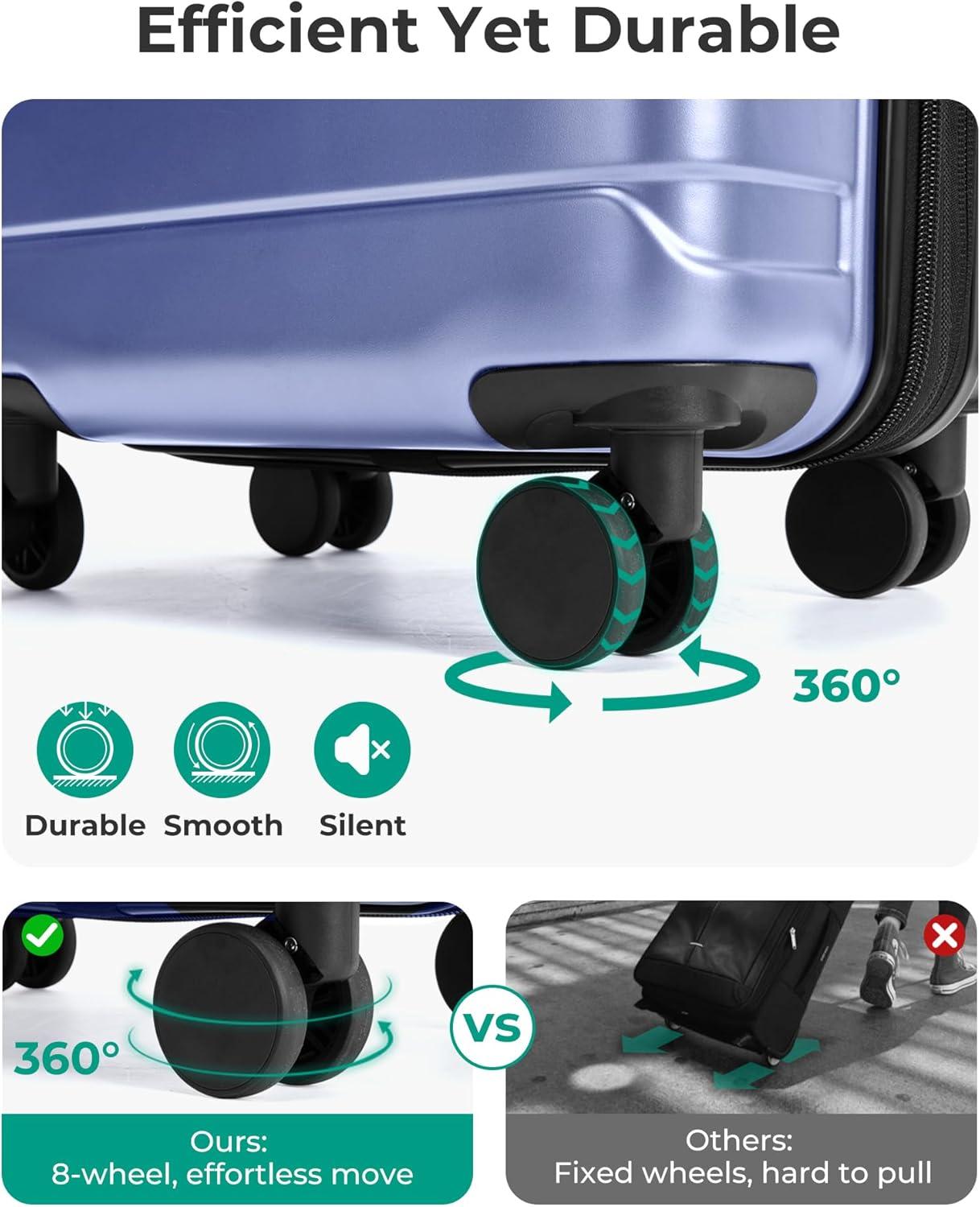 Superior Maneuverability: The rolling suitcase buttery smooth 360° swivel wheels are extremely quiet and durable, making it easy to navigate through airports, train platforms, sidewalks, and even cobblestone streets. The travel luggage has been upgraded with a sturdy and smooth four-level adjustable aluminum handle with multiple height options for your comfort. Soft silicone handles on the top and sides of the hard shell suitcases have been added to make the lightweight suitcase easier to lift