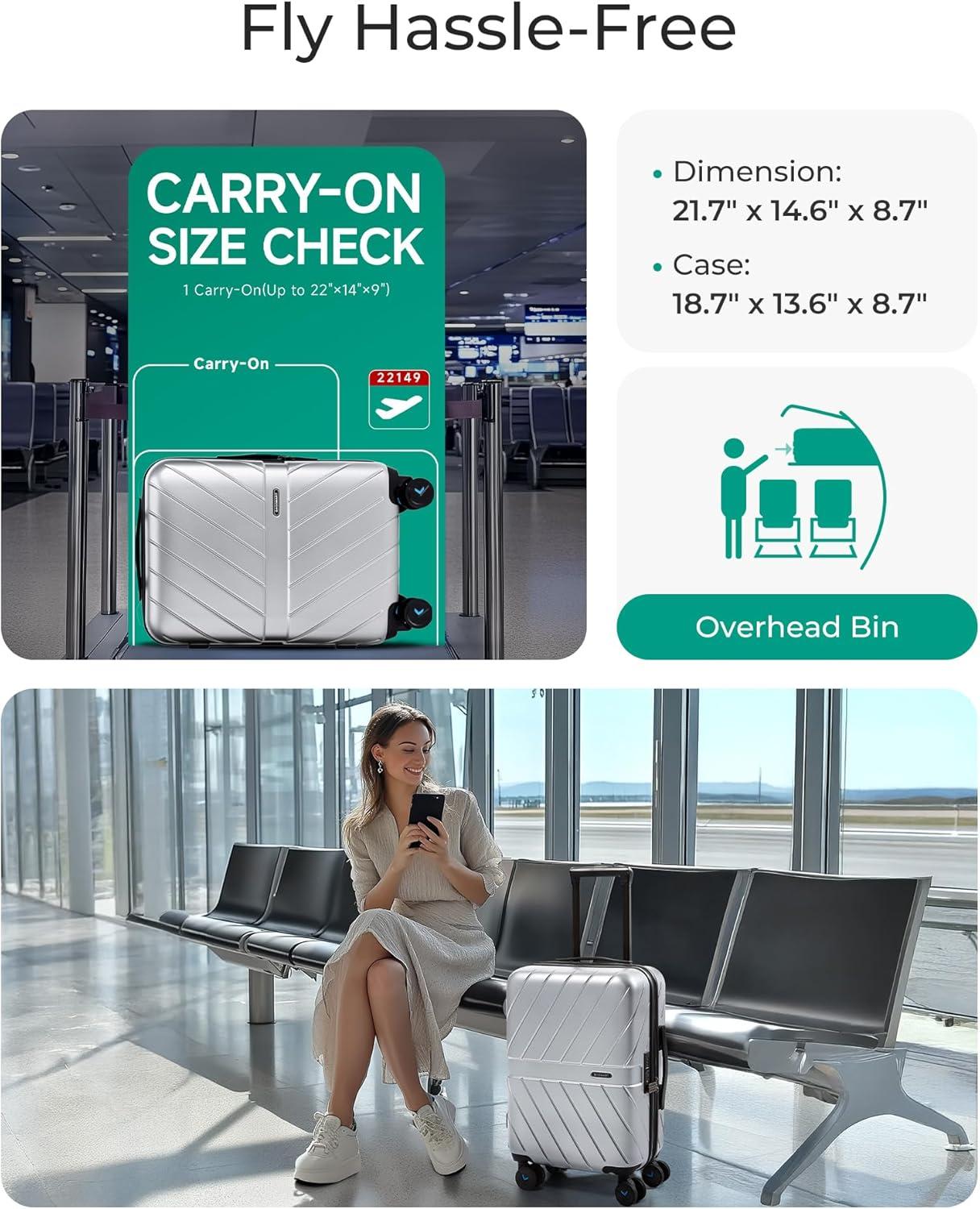 Airline Approved Luggage: Dimensions: 21.7 x 14 x 8.7 in (wheel and handle height included). Volume: 35 L. Weight: 6.39 lbs. The 20″ carry-on luggage size is designed to meet the airline requirements for most major airlines as a carry-on suitcase that can be placed in the overhead bin of almost any flight, anywhere in the world. No more paying for temporary consignments.