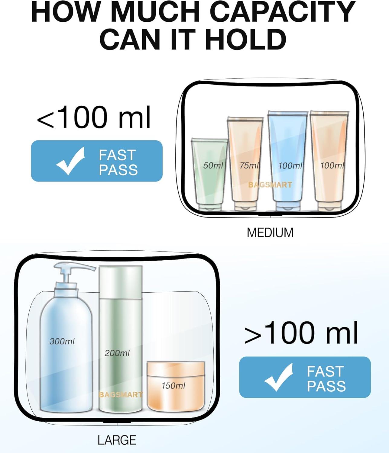 Carry-on Size: The travel toiletries bags two pack, with dimensions of 8.2 x 2 x 6 inches, strictly follow the TSA 3-1-1 liquids rule; With a TSA quart-size travel bag, you can easily and quickly pass through security screening at the airport, saving your time and reducing stress