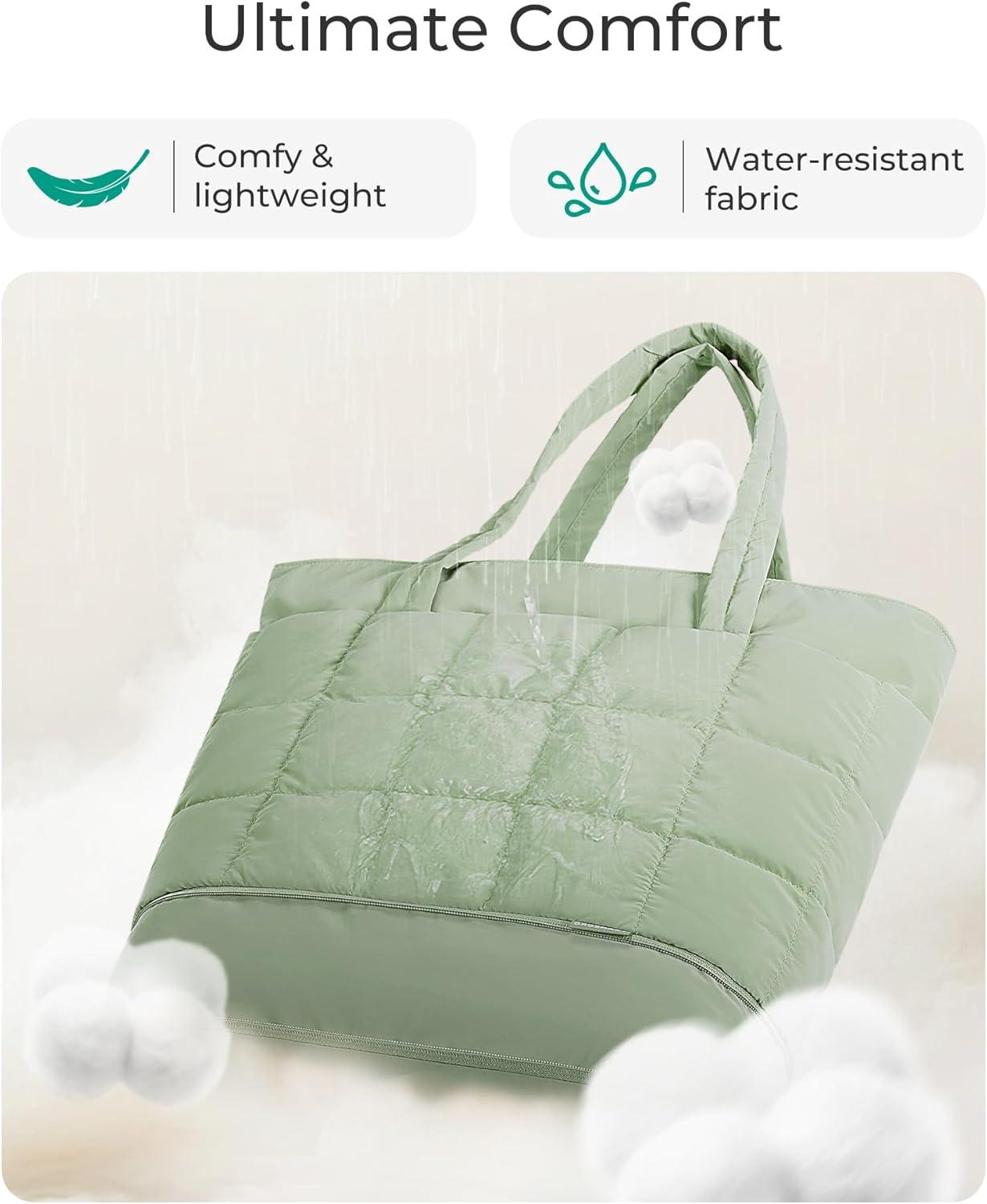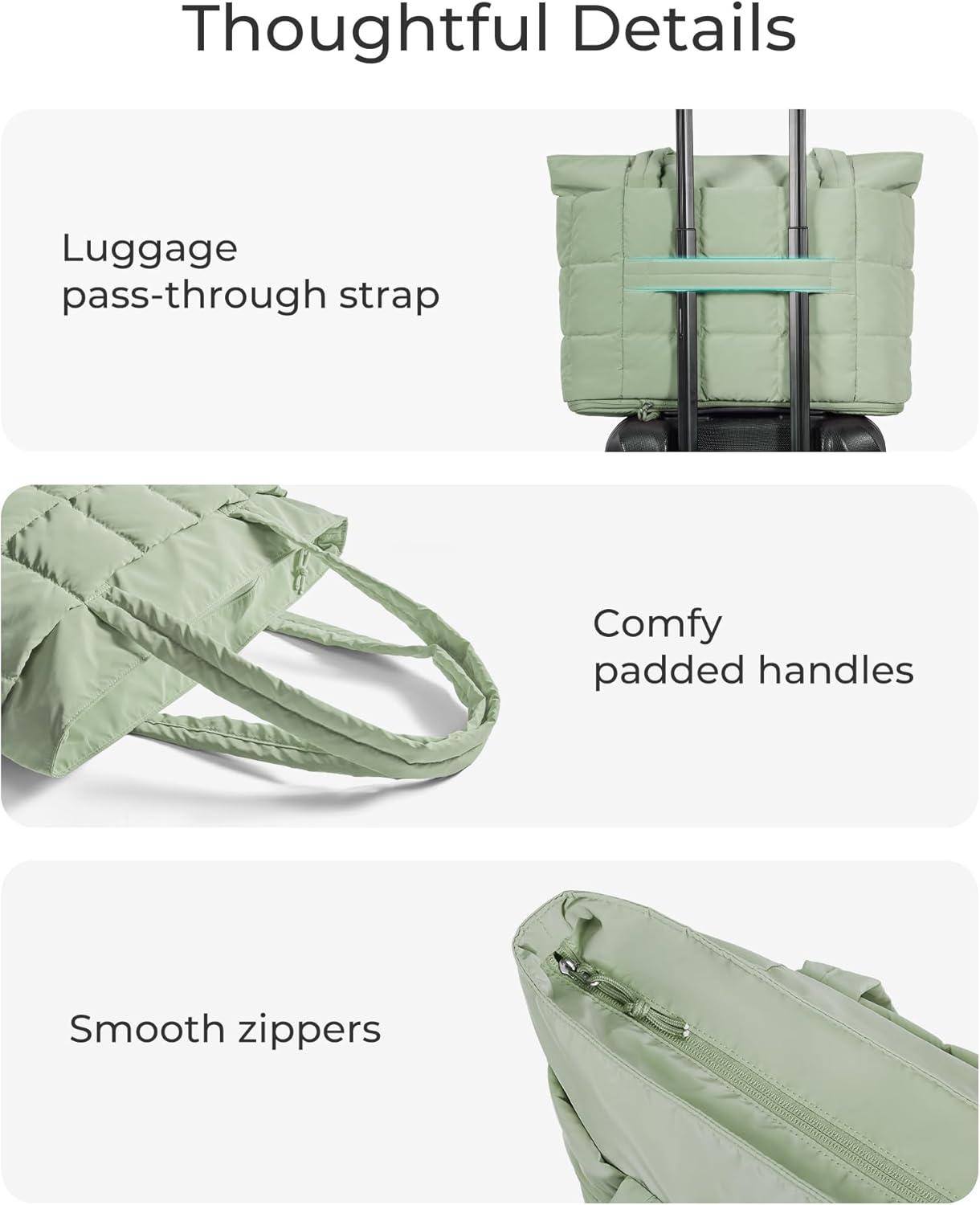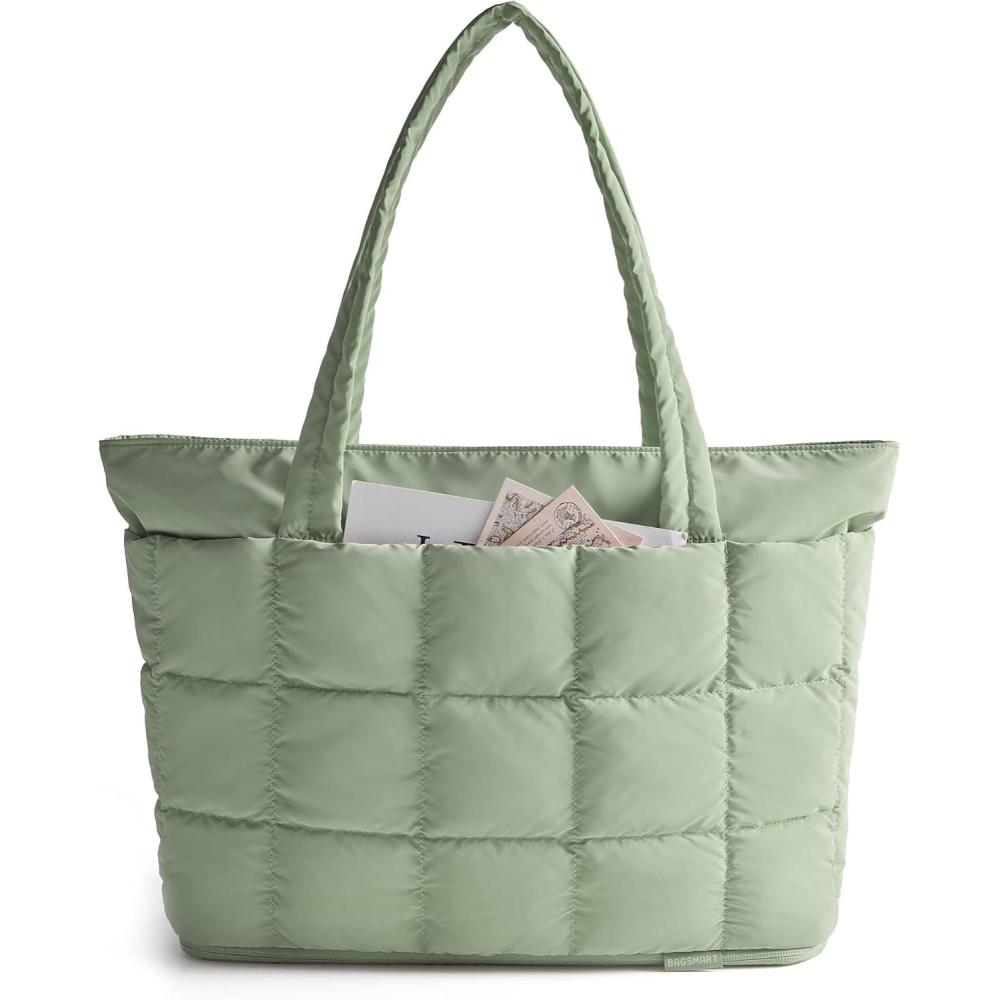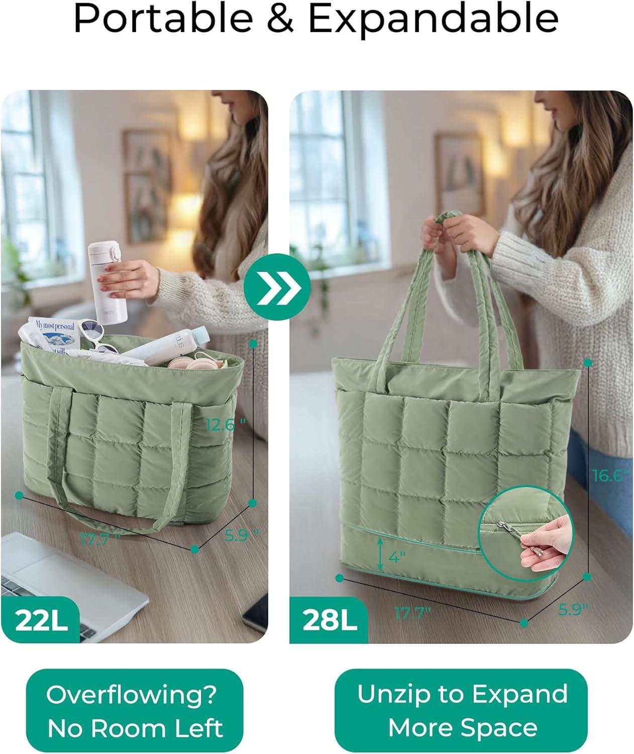 BAGSMART Expandable Tote Bag for Women, Puffer Work Tote Handbag, Quilted Carry On Bag for Travel Gym(Green)