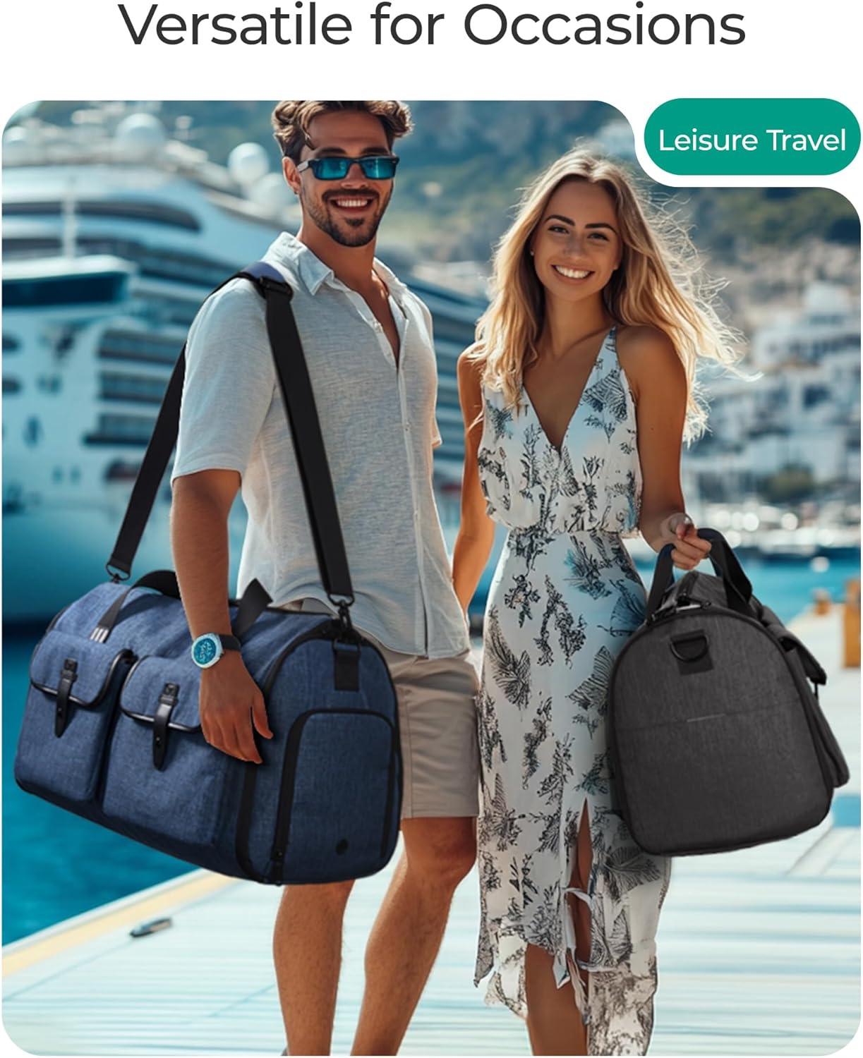 Spacious and Organized Storage: Boasting a capacious 45L interior, this garment duffle bag keeps your belongings meticulously organized with specialized compartments. Revolutionize the way you pack with a plethora of purpose-driven pockets. Safeguard your ties in the dedicated tie pocket, pack your elegant attire in the extended garment pocket, and utilize the inner mesh storage pockets and external quick-grab pockets for seamless access to your essentials. The ventilated shoe compartment adds an extra layer of organization and convenience