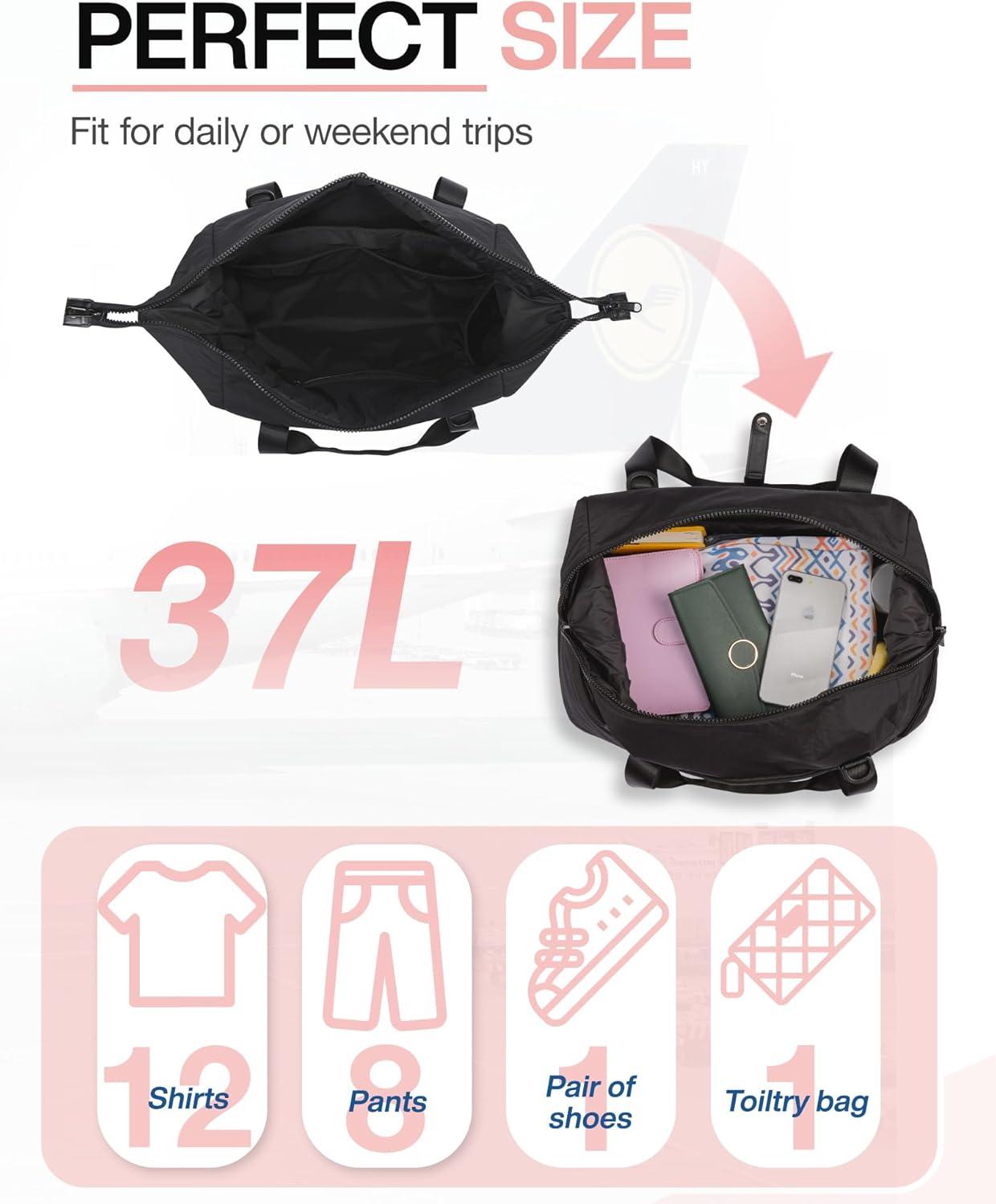 Compact Size- 18.5 x 8.7 x 11 inUltra Lightweight- Weekender bag weights only 1.8 pounds. Lightweight and soft nylon fabric makes your carrying comfortable.ch, meets most carry-on requirements.