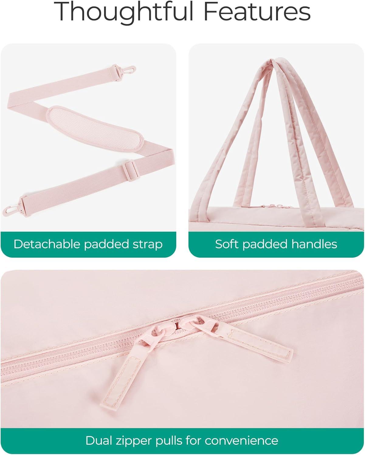 BAGSMART Gym Bag for Women, Lightweight Puffer Duffle Bag 2-PC Travel Bag, 31L Weekender Overnight Bag Quilted Carry On Tote Bag, Diaper Hospital Dance bag for Travel, Gym, Water Resistant, Pink(Baby Pink)