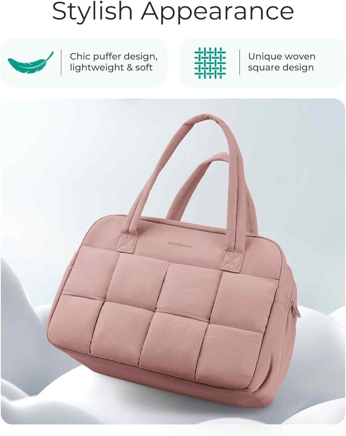 BAGSMART Gym Bag for Women, Personal Item Puffer Duffle Bag, Weekender Overnight Carry On Tote Handag for Travel(Dark Pink)