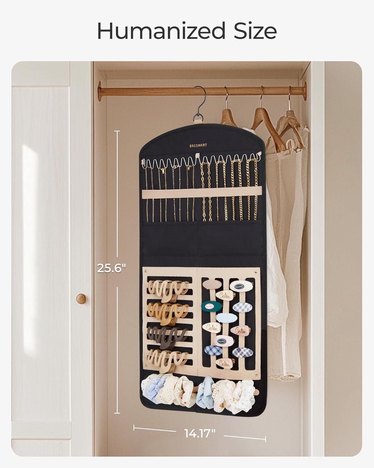 BAGSMART Hanging Jewelry Organizer Claw Clip Necklace Holder Roll for Hair Ties, Headbands, Clips, Earrings, Necklaces, Glasses Double-Sided on Closet, Wall, Door, 1 piece, Large-Black(Black)