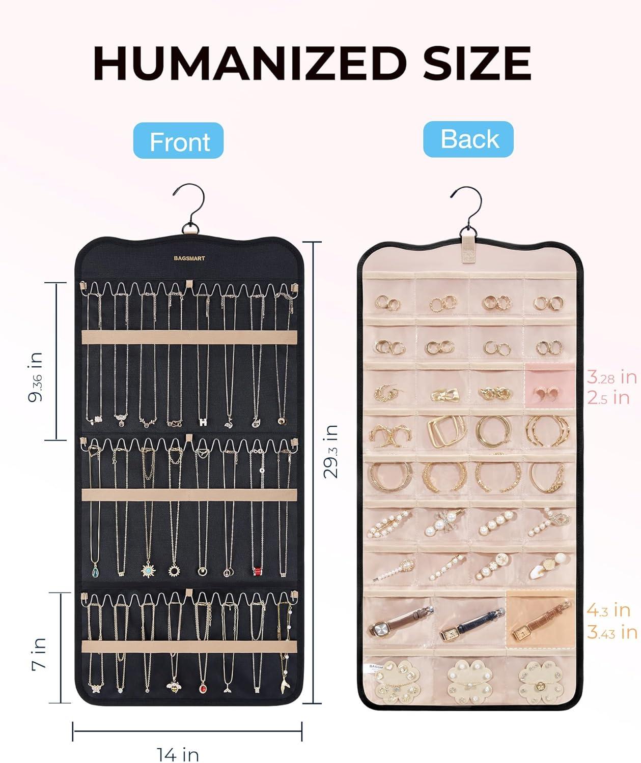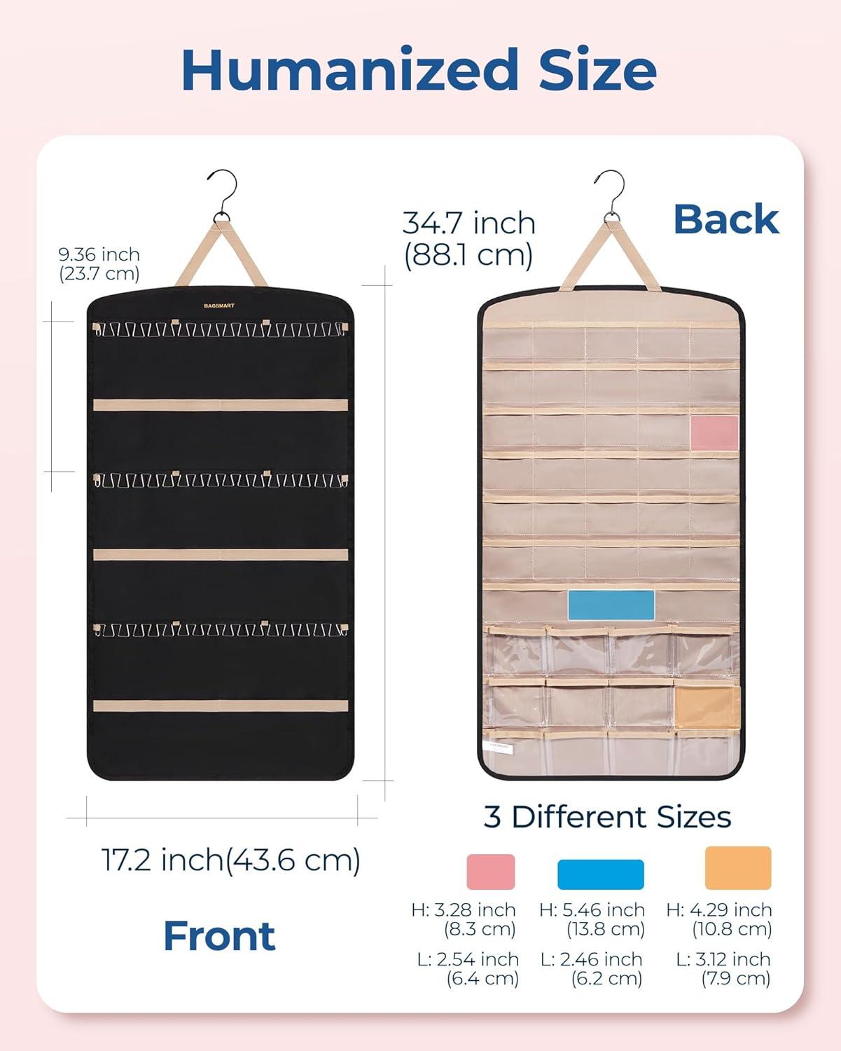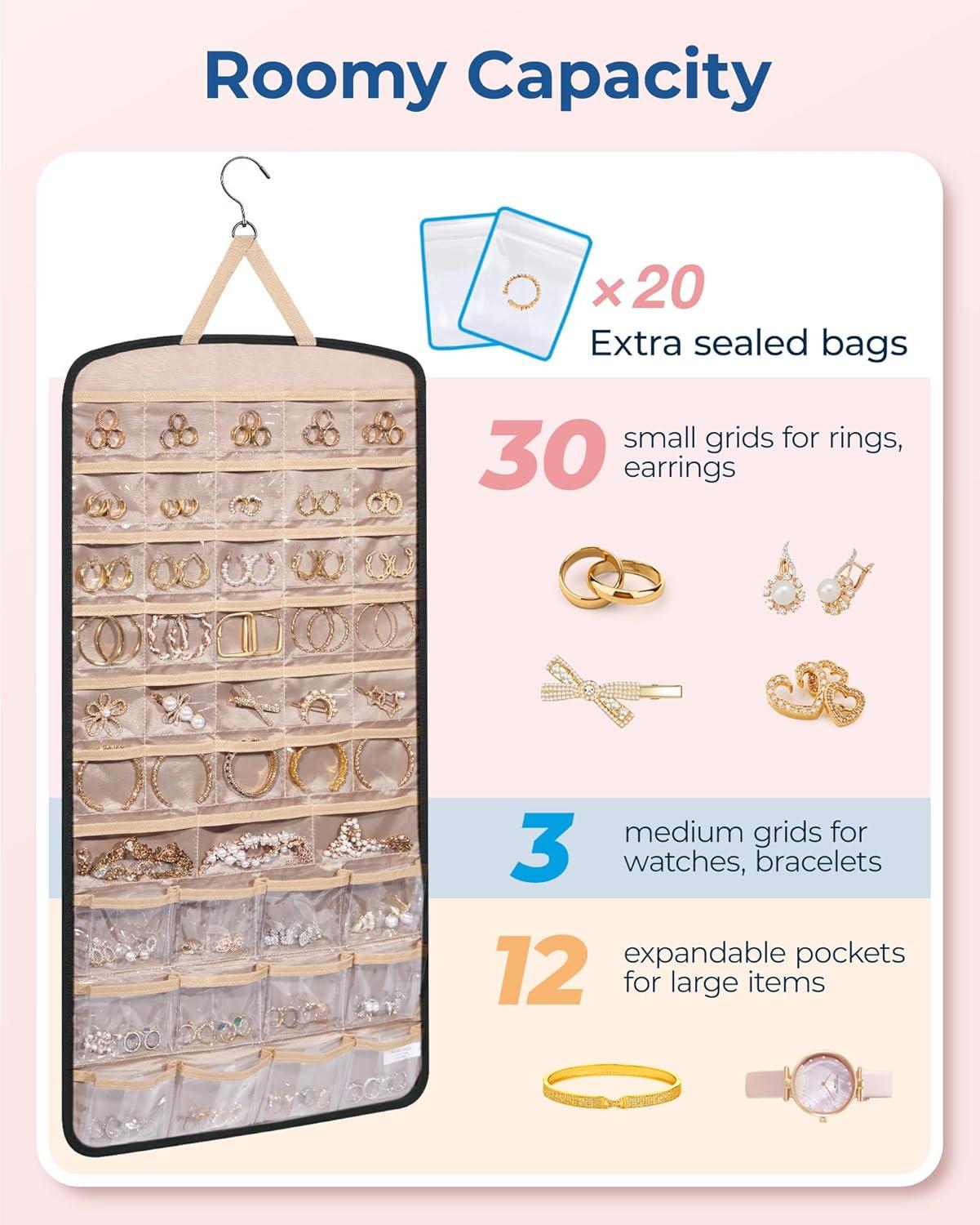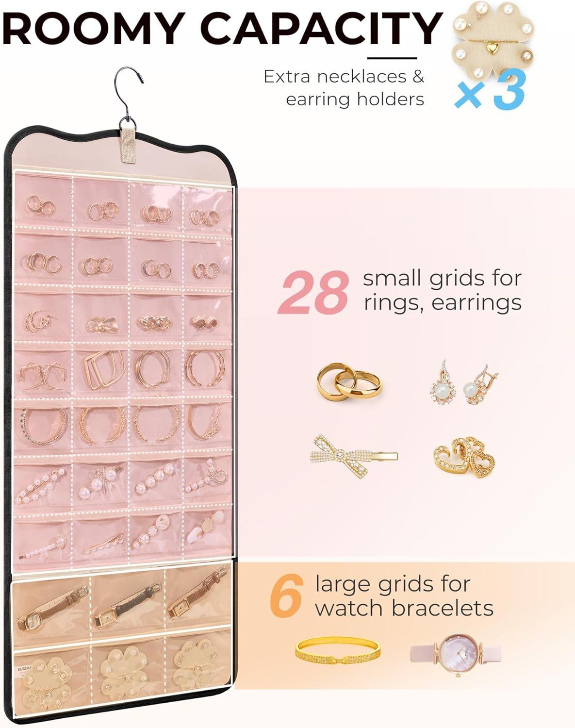 Roomy Capacity- Double-sided hanging jewelry organizer offers generous storage space. It's designed with 32 transparent pockets on one side, perfect for holding rings, earrings, bracelets, watches, hairpins, and other small jewelry items. The other side is designed to accommodate up to 42 necklaces.