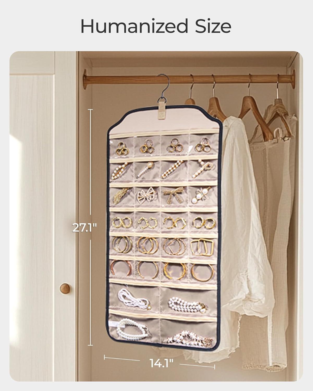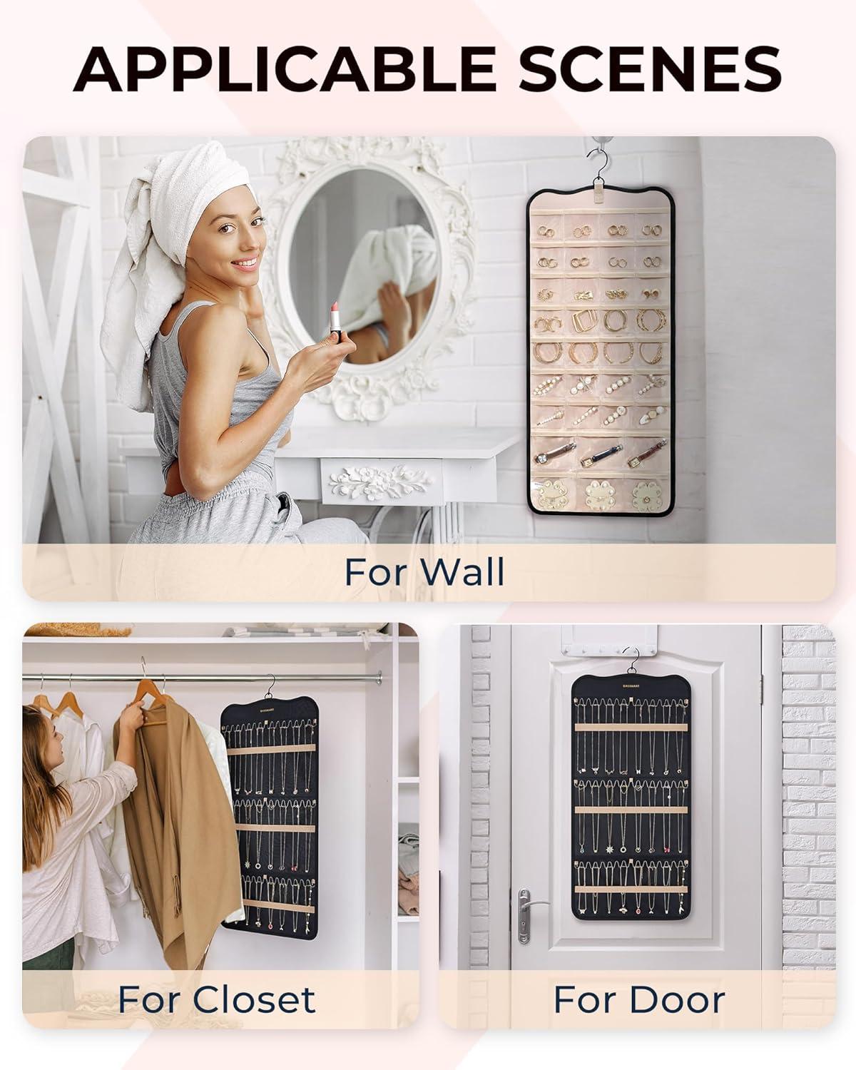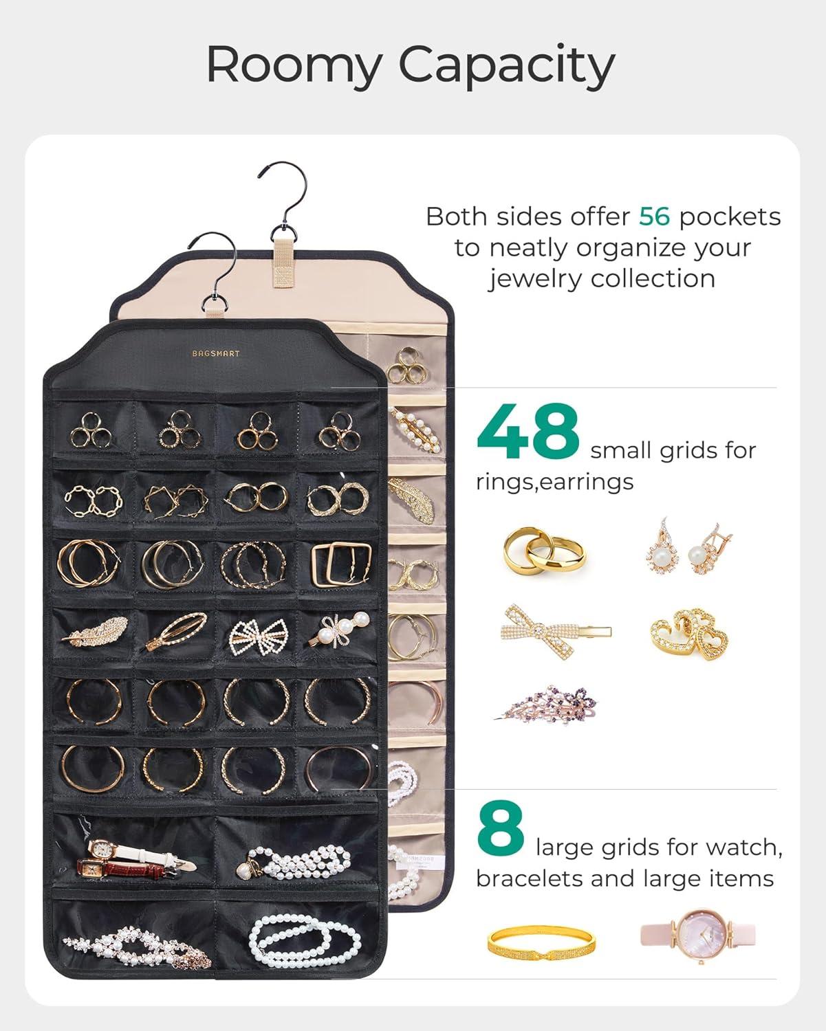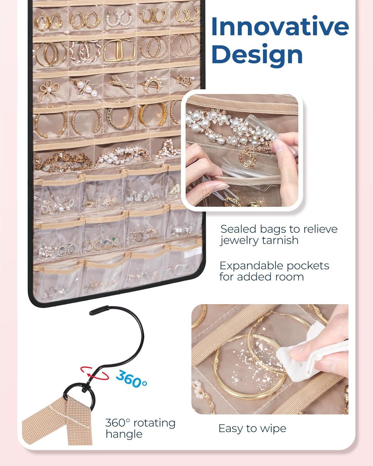 Roomy Capacity- Double-sided hanging jewelry organizer offers generous storage space. It's designed with 32 transparent pockets on one side, perfect for holding rings, earrings, bracelets, watches, hairpins, and other small jewelry items. The other side is designed to accommodate up to 42 necklaces.