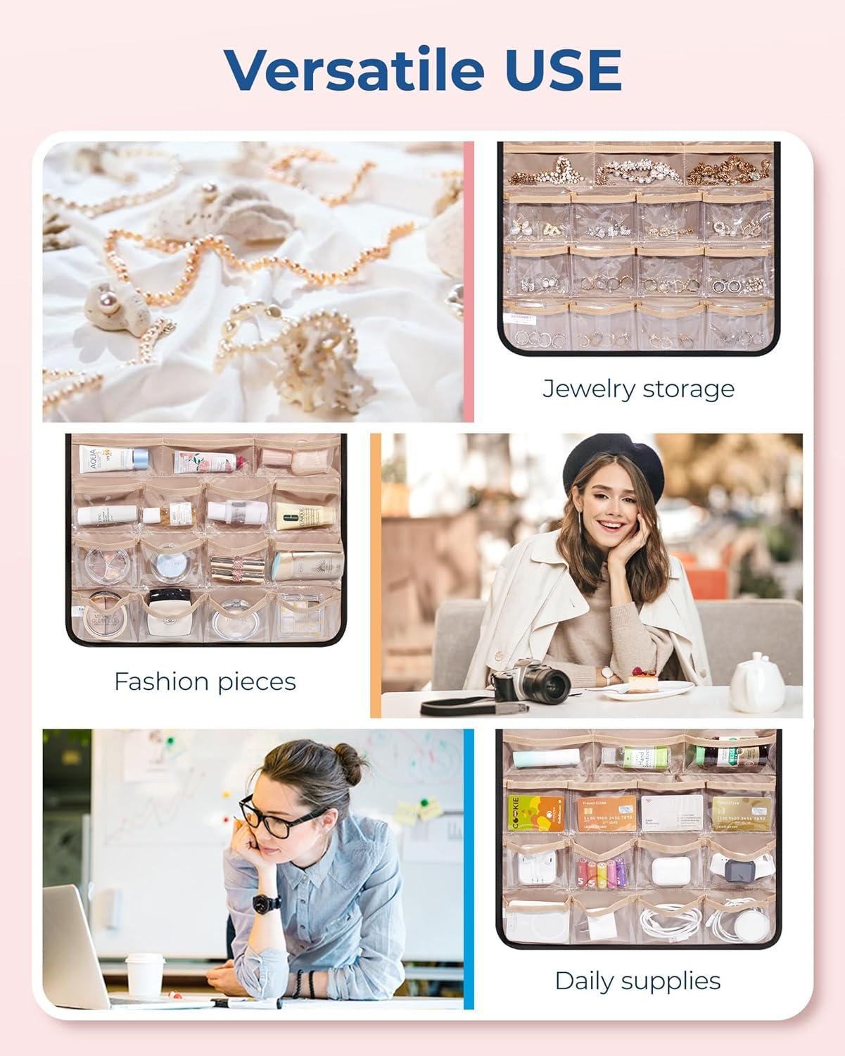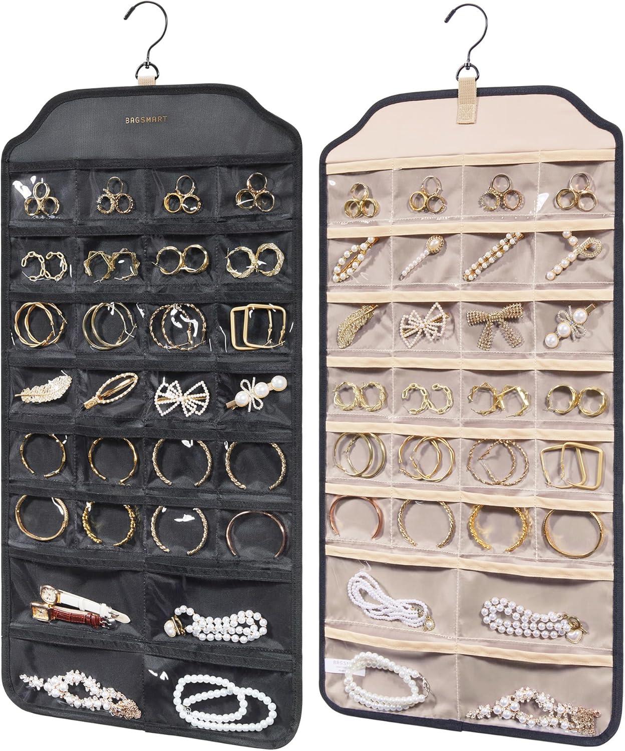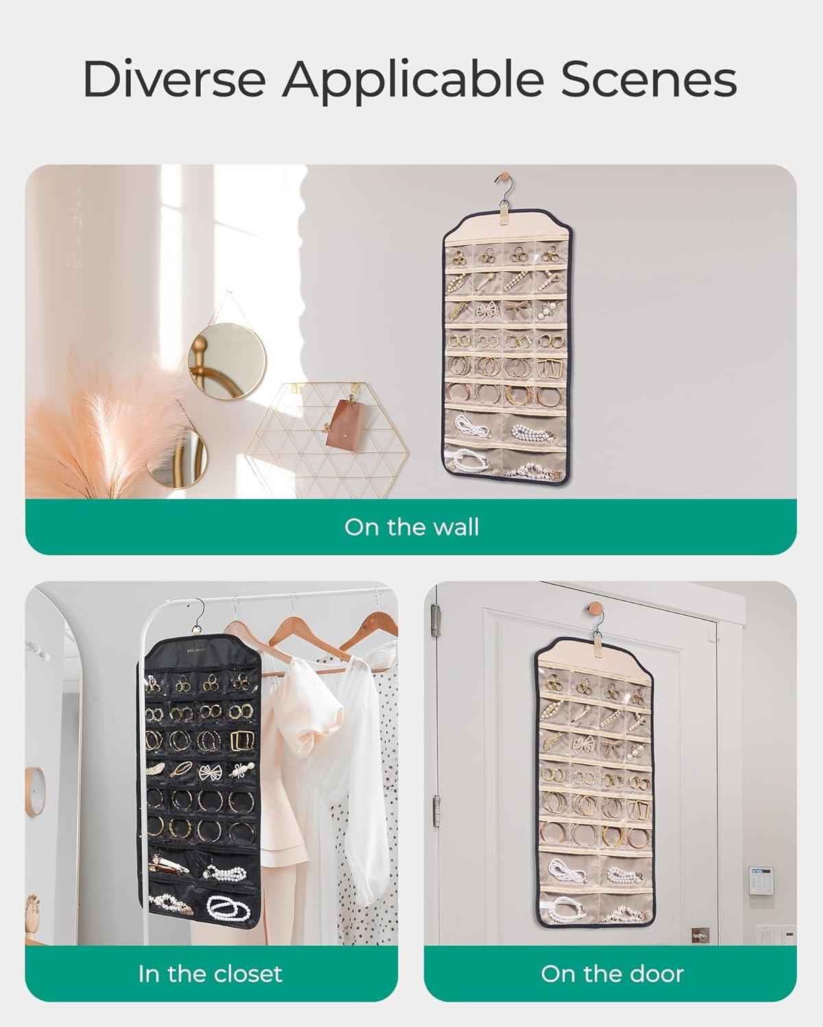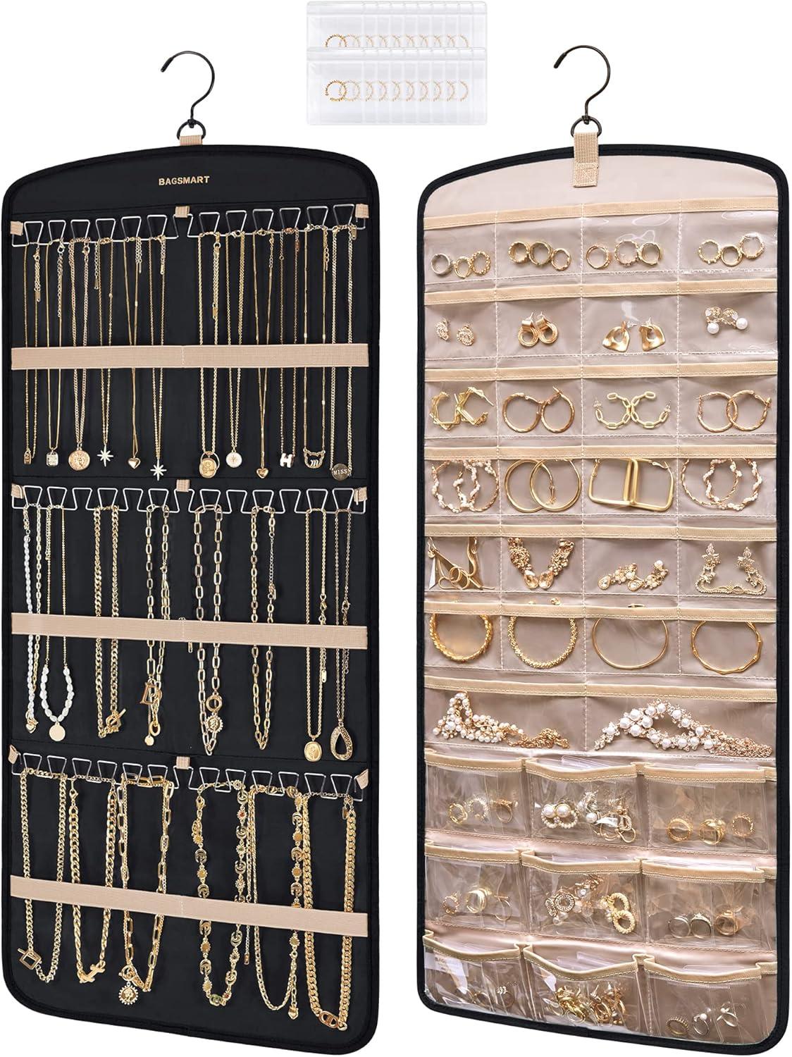 Roomy Capacity- Double-sided hanging jewelry organizer offers generous storage space. It's designed with 32 transparent pockets on one side, perfect for holding rings, earrings, bracelets, watches, hairpins, and other small jewelry items. The other side is designed to accommodate up to 42 necklaces.