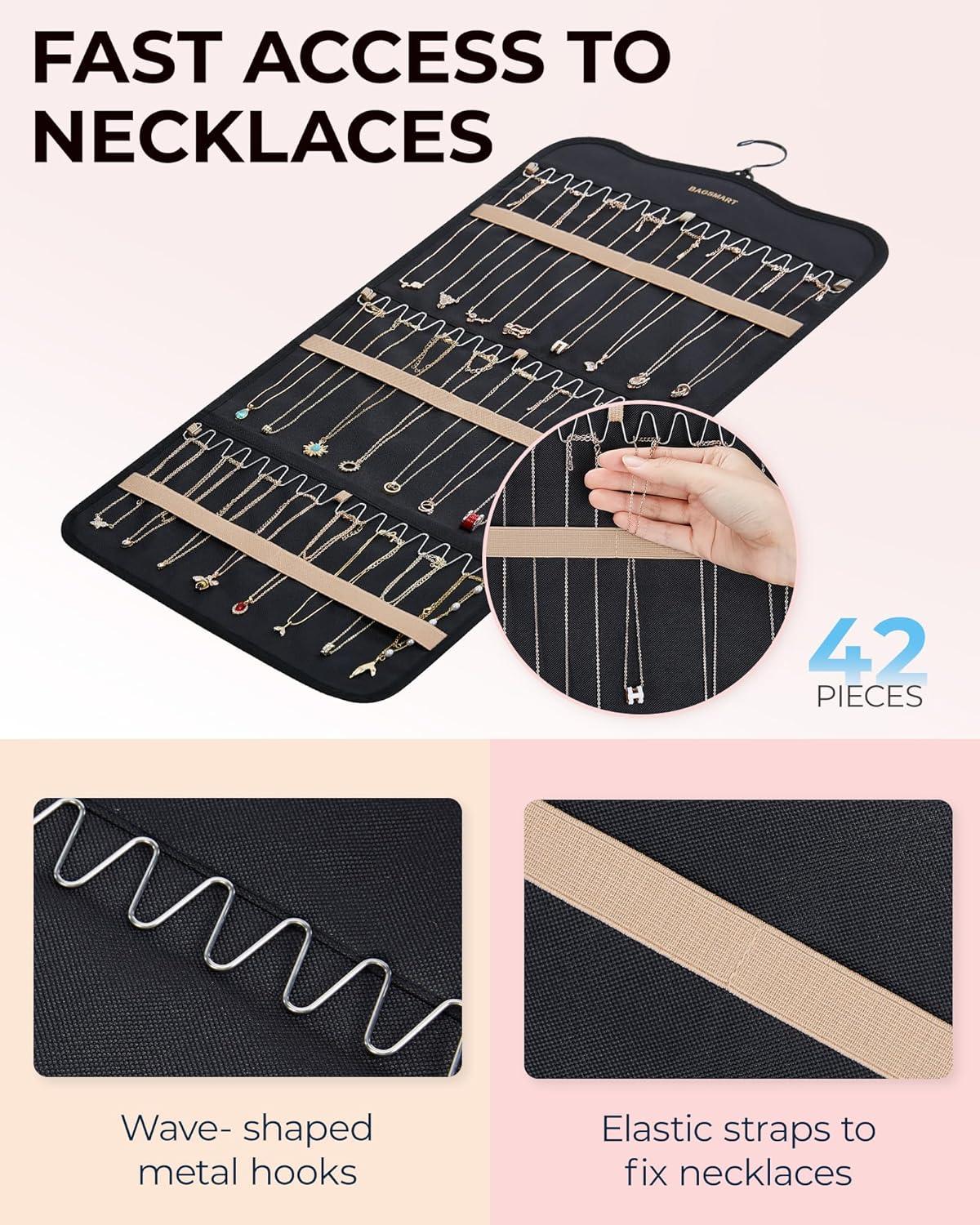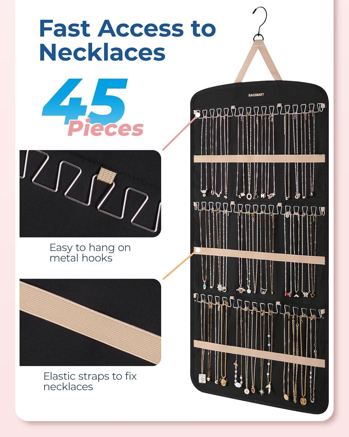 Exclusive Necklaces Hooks- Jewlery hanger comes with three rows of sturdy metal hooks in a unique “wave-shaped” design, capable of securely holding up to 42 necklaces. This exclusive feature provides a faster and easier way to take out and place necklaces. Additionally, elastic straps keep the necklaces separated and prevent tangling, making it ideal for those who frequently change their necklaces.