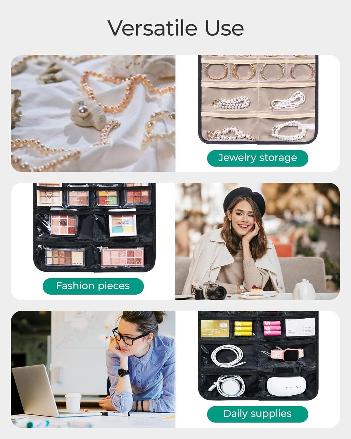 Multifunctional Storage Bag- This stylish jewelry organizer serves as an excellent solution for storing, sorting, and displaying various items. It is not only suitable for jewelry but also works well for hair accessories, nail polishes, makeup, toiletries, crafts, cables, cards, and more. The dimensions of the organizer are 14.25'' x 33.25'', weighing only 0.55lb. Its foldable feature enables you to conveniently pack it into a small pouch for travel purposes.