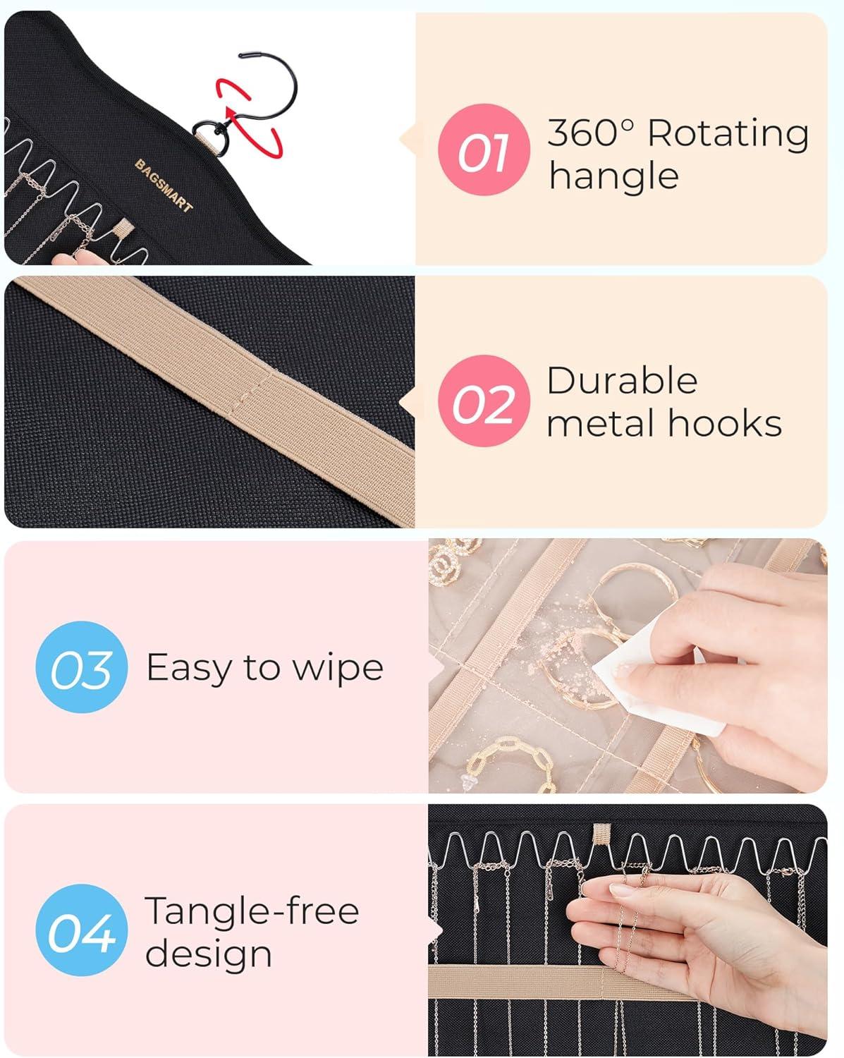 Perfect organizational partner- Crafted from durable polyester, PVC materials, and featuring strong metal hooks, our jewelry holder organizer is built to last. Its exquisite design is further enhanced by the leather logo. The two-sided design, along with the 360-degree rotating hanger, allows for easy rotation in any direction and effortless hanging on a closet, door, or wall. It takes up minimal space, equivalent to that of a single item of clothing in your closet.