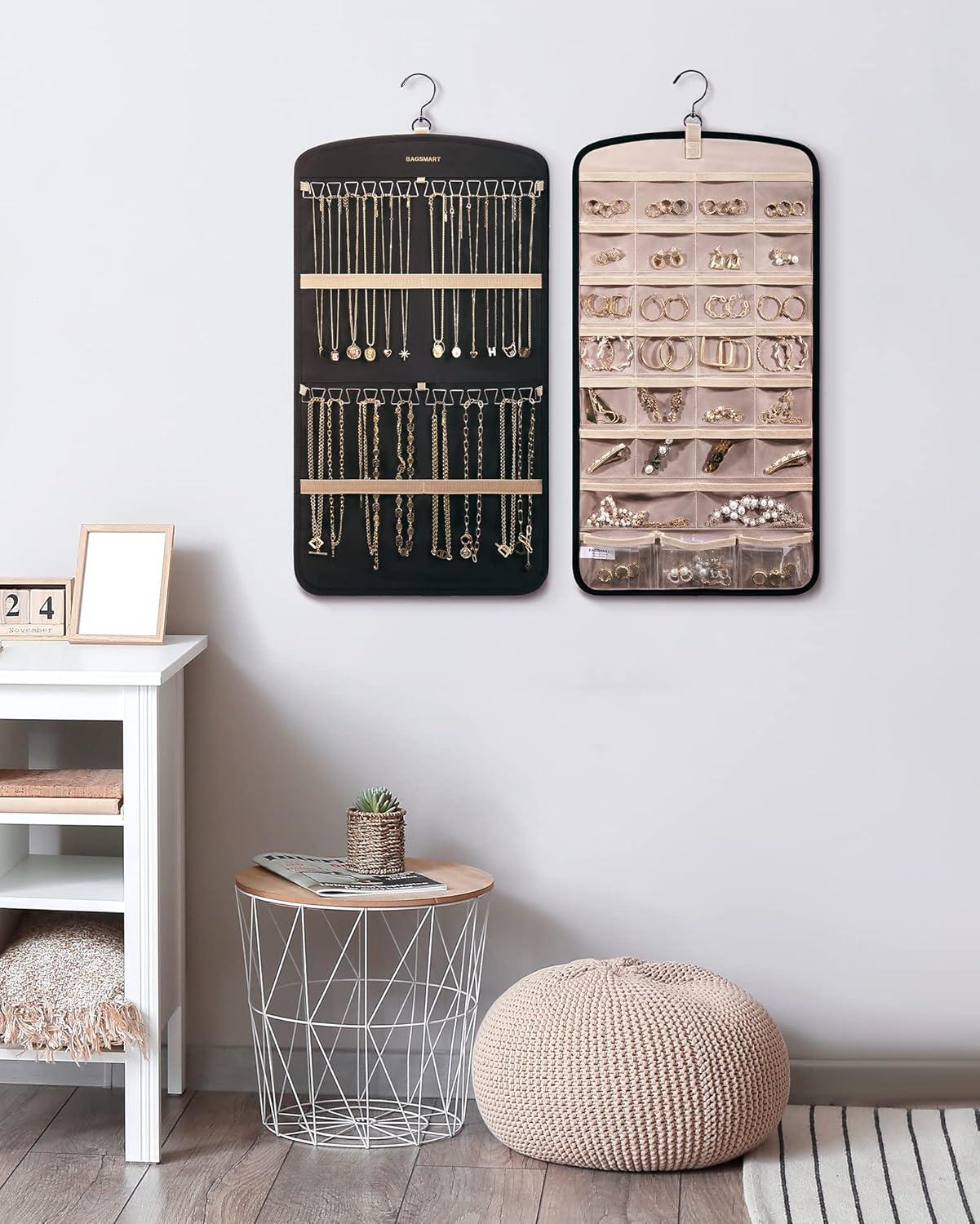 BAGSMART Hanging Jewelry Organizer Storage with Hanger Metal Hooks Double-Sided Jewelry Holder for Earrings, Necklaces, Rings on Closet, Wall, Door, 1 piece Large Black(Black)