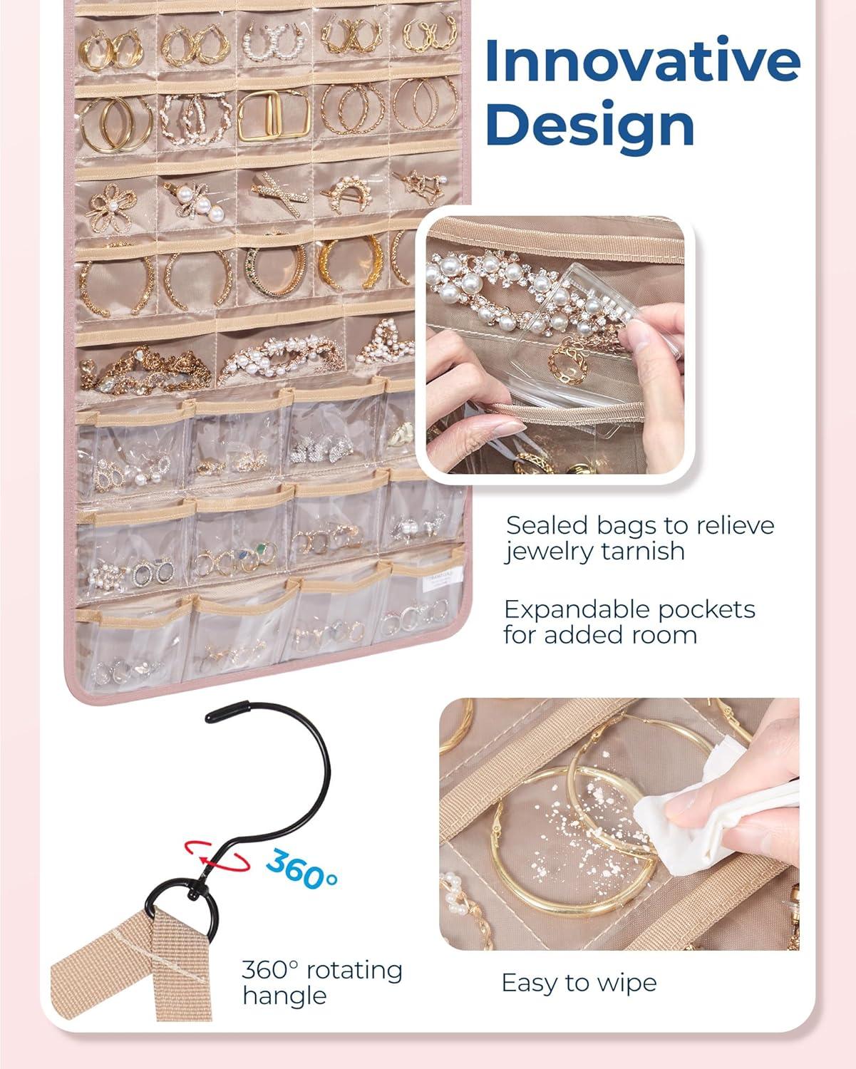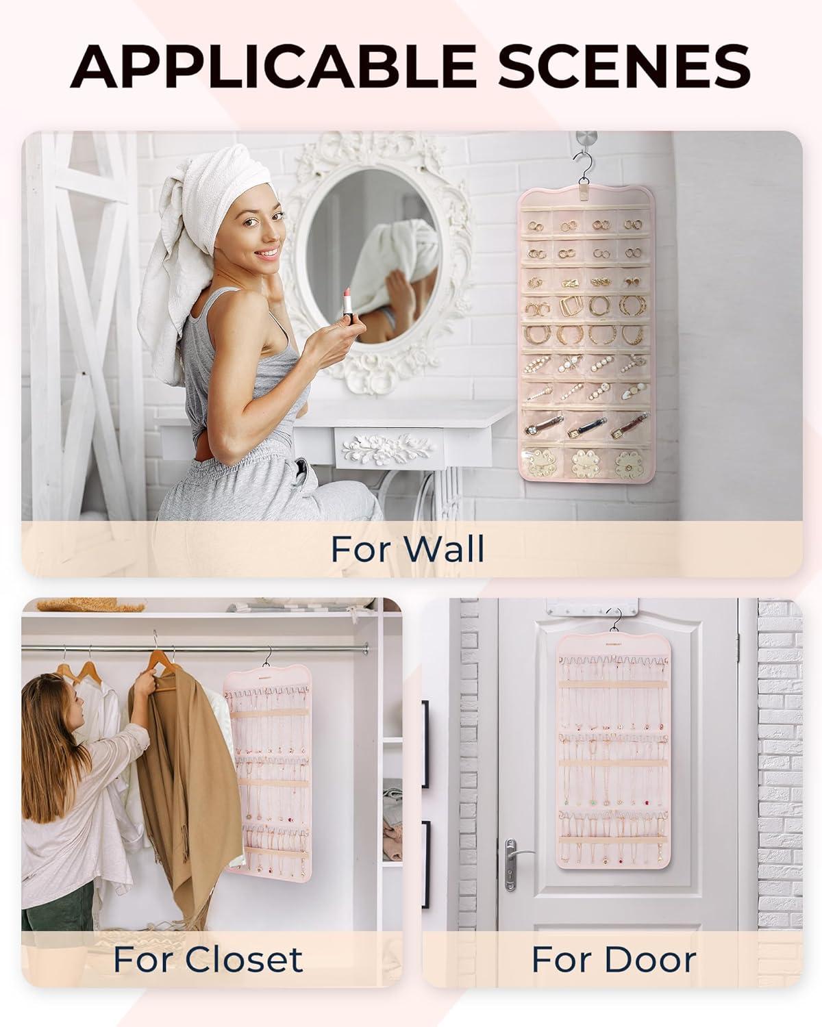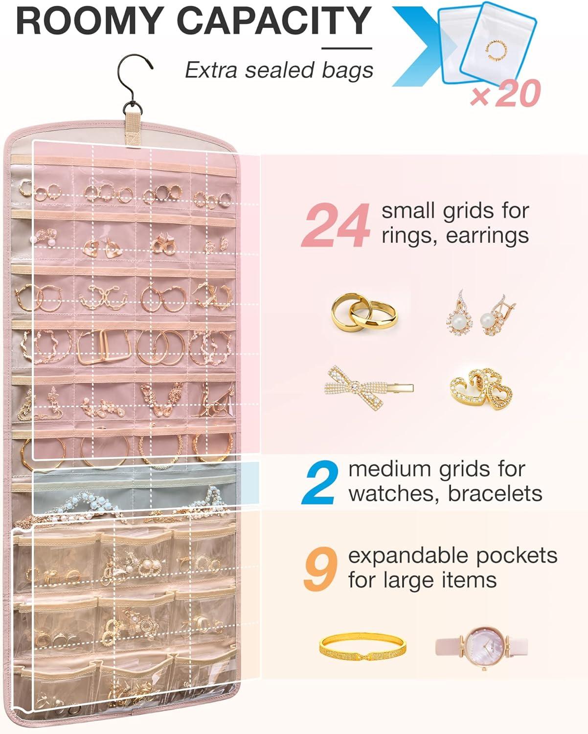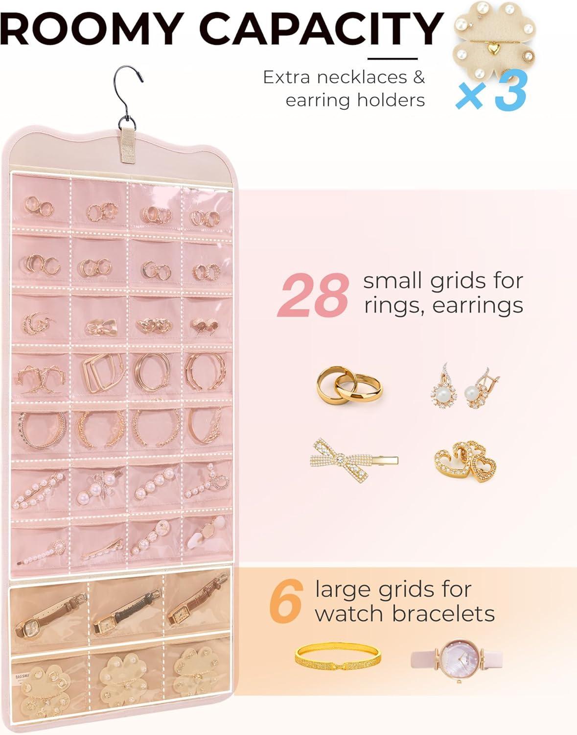 Roomy Capacity- Double-sided hanging jewelry organizer offers generous storage space. It's designed with 32 transparent pockets on one side, perfect for holding rings, earrings, bracelets, watches, hairpins, and other small jewelry items. The other side is designed to accommodate up to 42 necklaces.