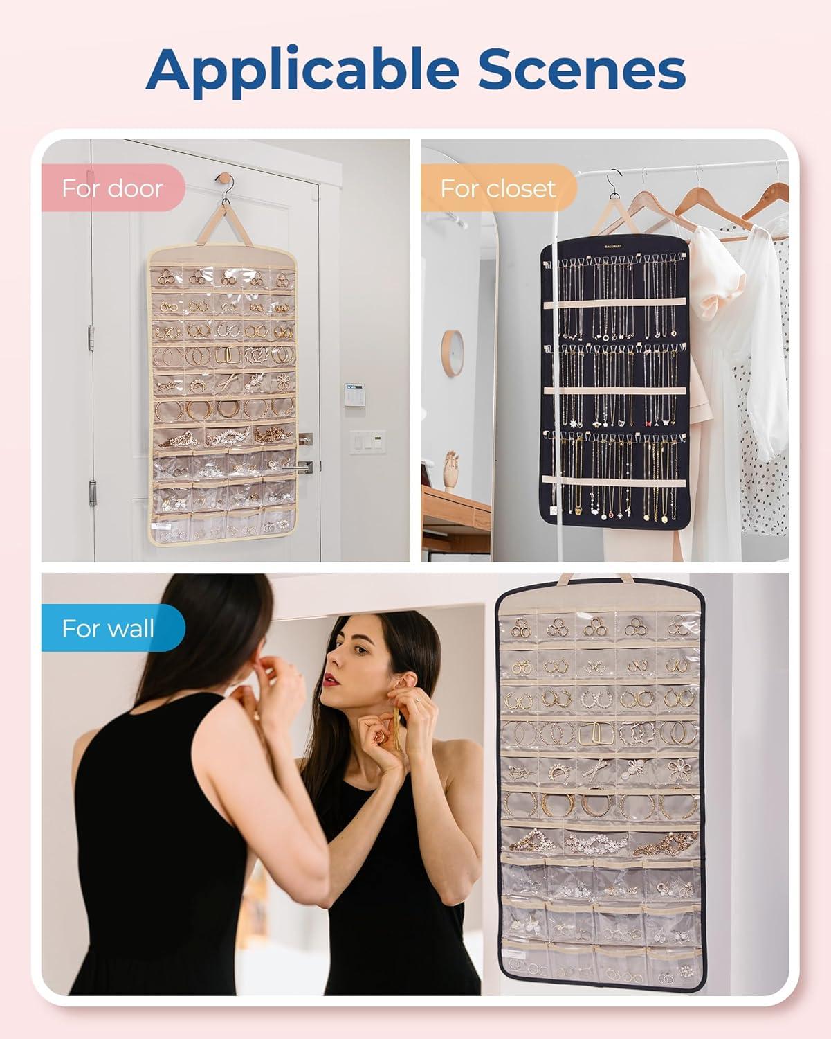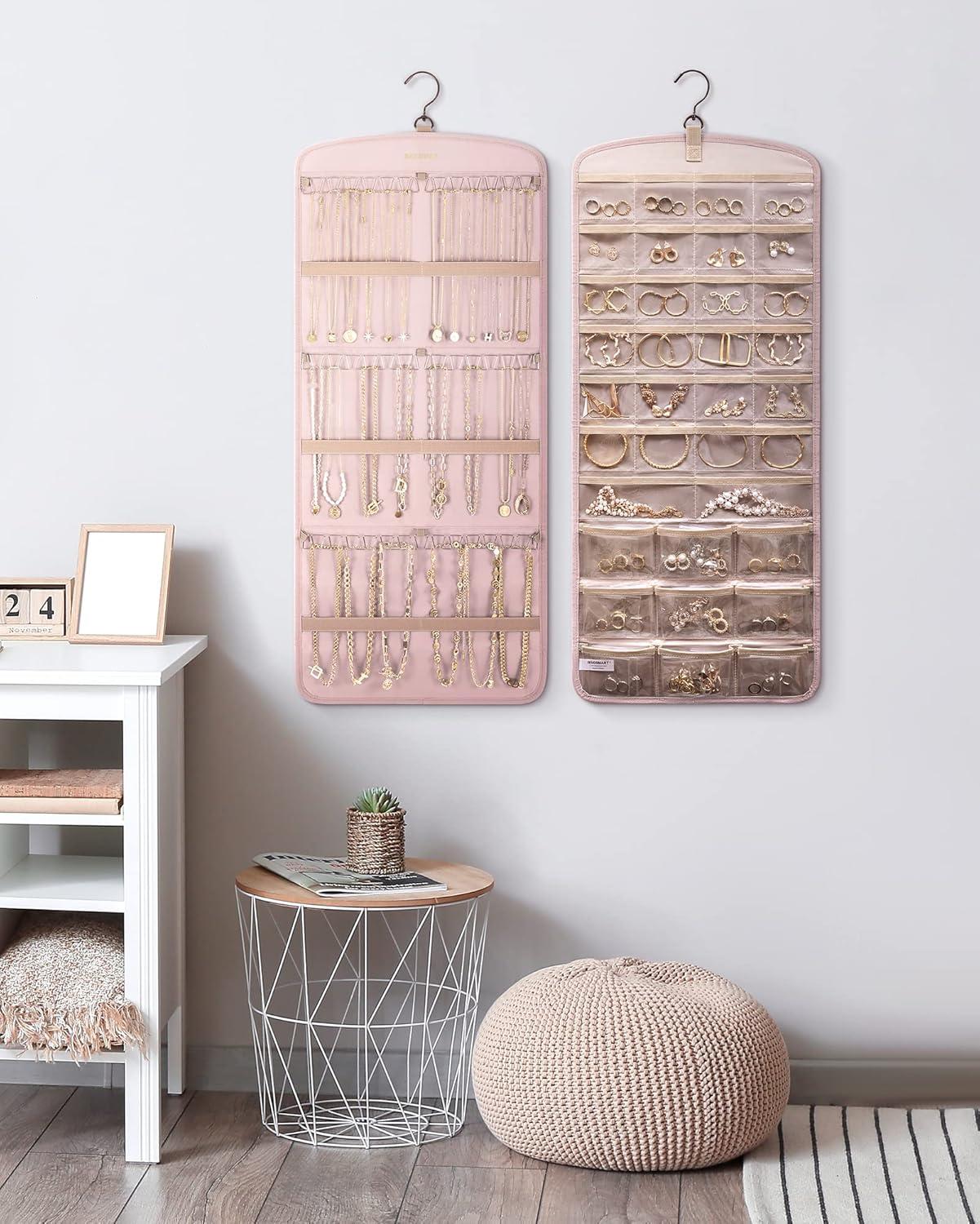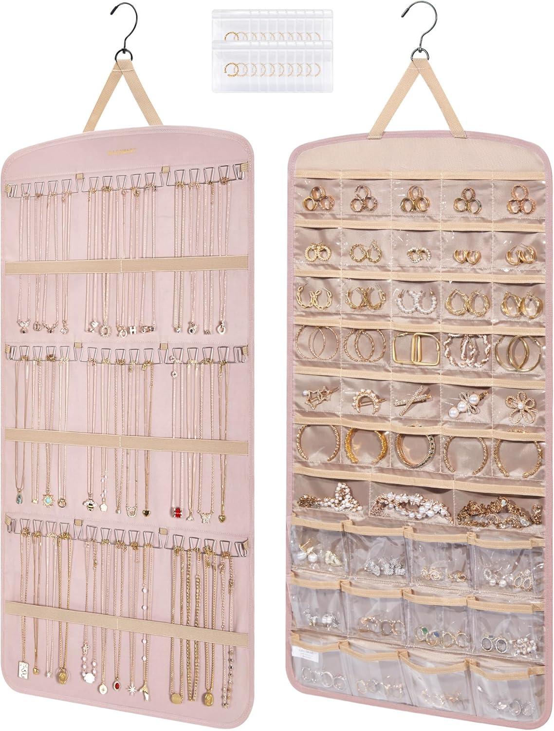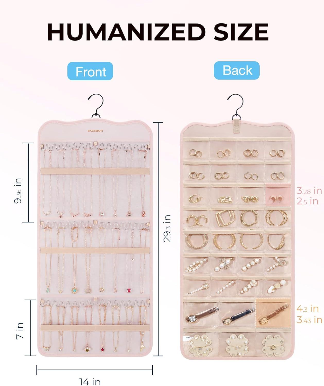 Roomy Capacity- Double-sided hanging jewelry organizer offers generous storage space. It's designed with 32 transparent pockets on one side, perfect for holding rings, earrings, bracelets, watches, hairpins, and other small jewelry items. The other side is designed to accommodate up to 42 necklaces.
