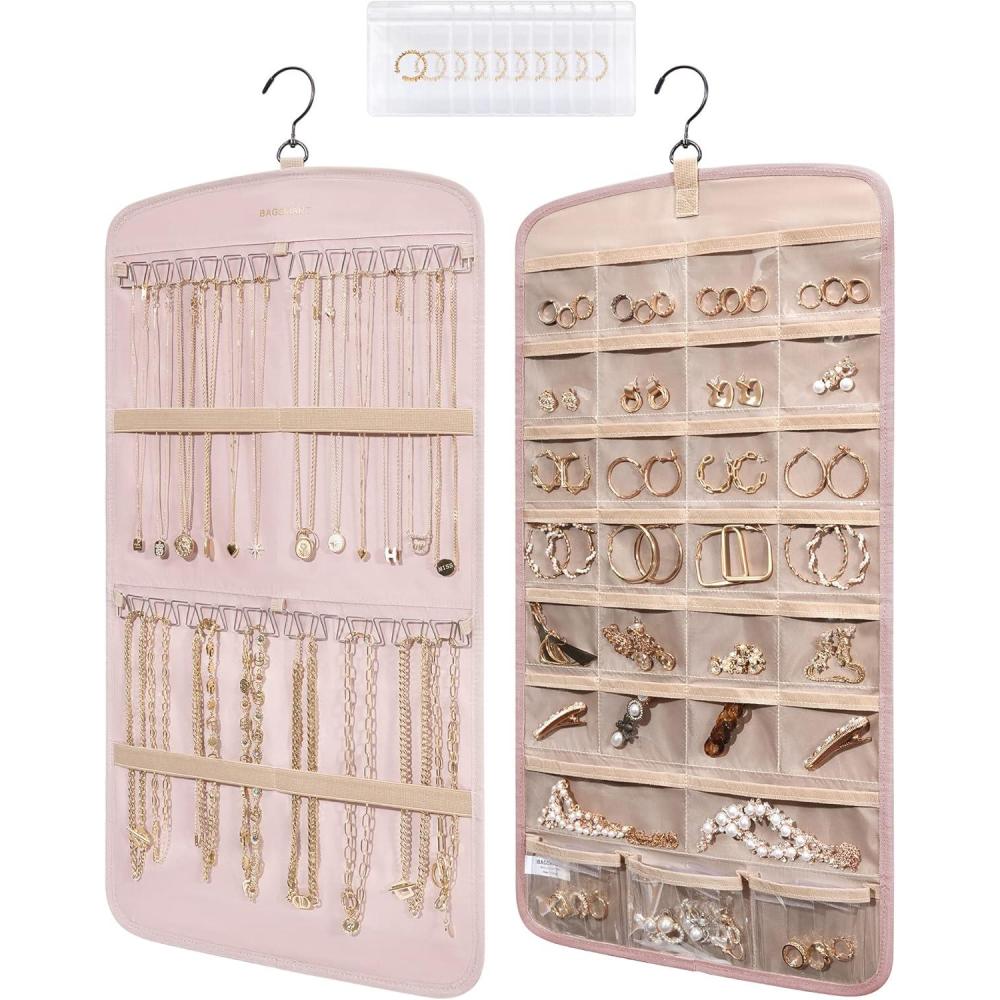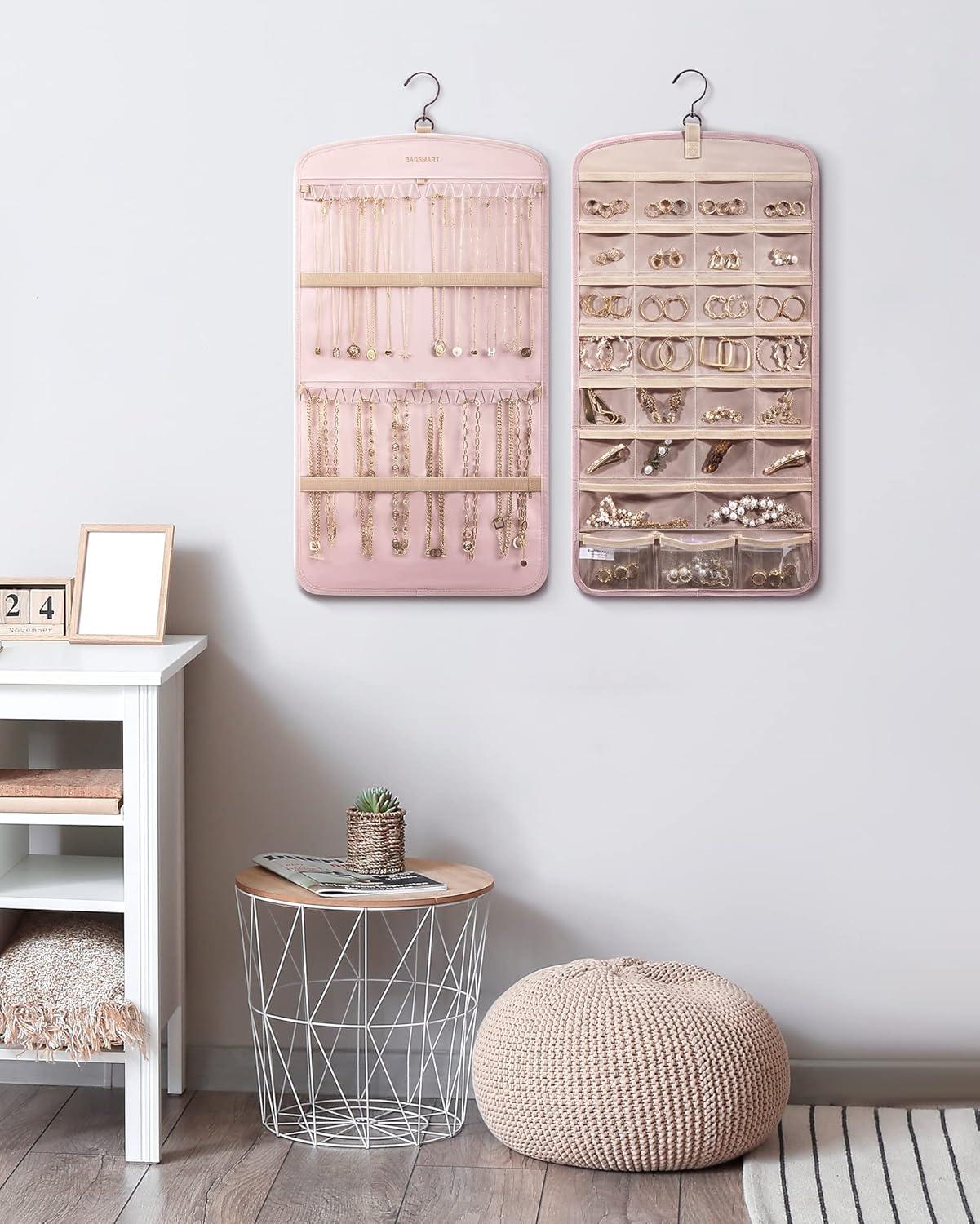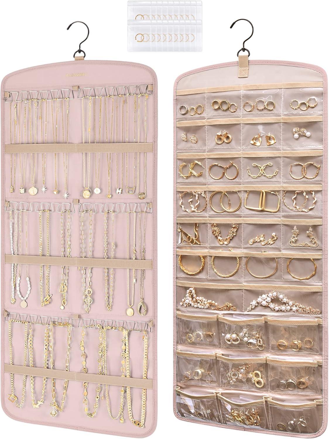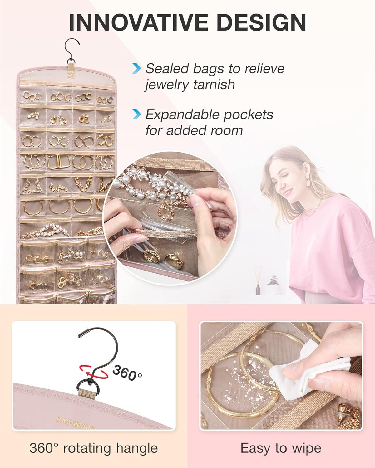 Roomy Capacity- Double-sided hanging jewelry organizer offers generous storage space. It's designed with 32 transparent pockets on one side, perfect for holding rings, earrings, bracelets, watches, hairpins, and other small jewelry items. The other side is designed to accommodate up to 42 necklaces.