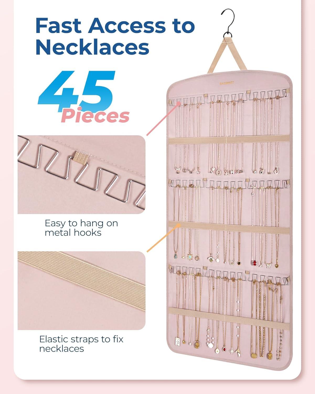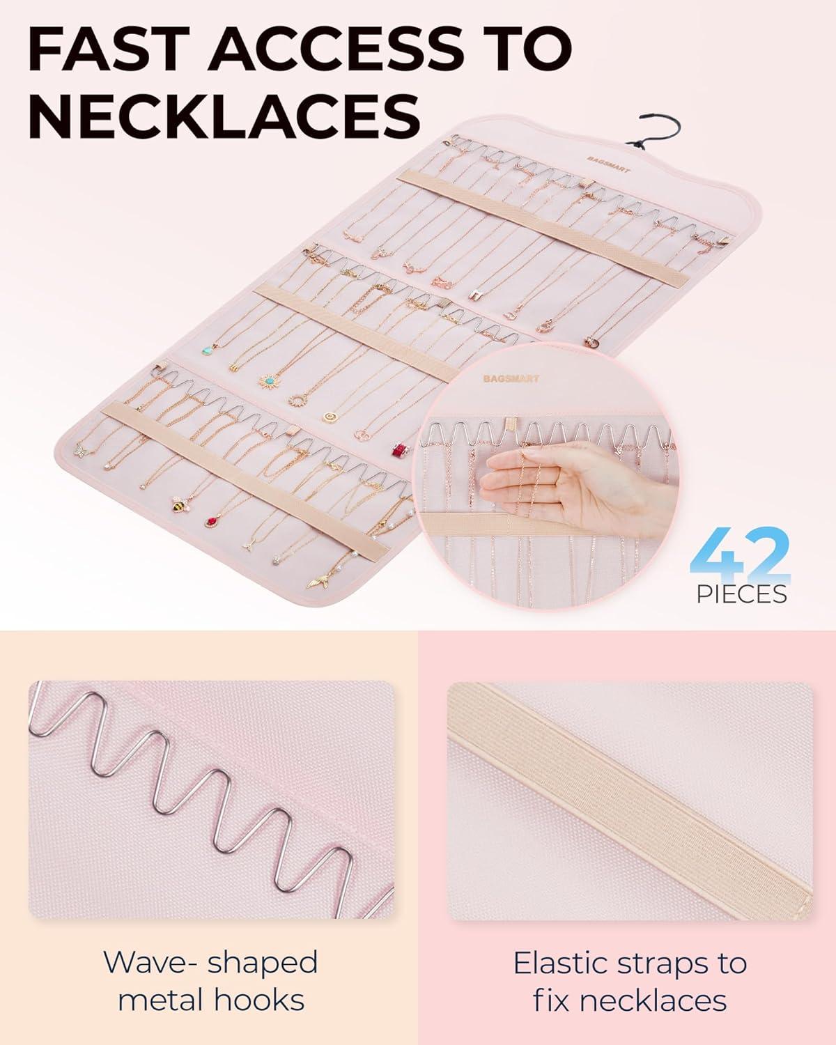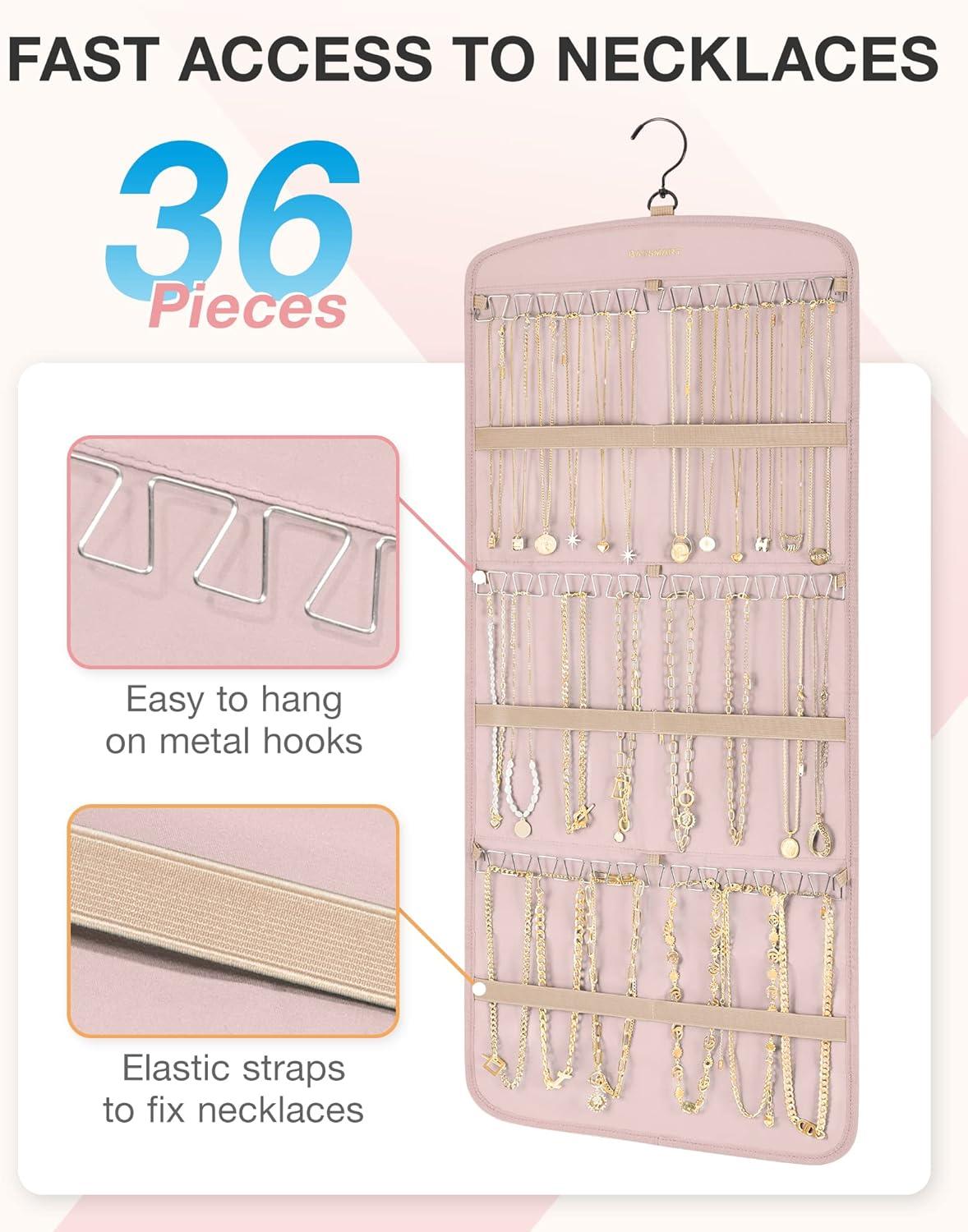 Exclusive Necklaces Hooks- Jewlery hanger comes with three rows of sturdy metal hooks in a unique “wave-shaped” design, capable of securely holding up to 42 necklaces. This exclusive feature provides a faster and easier way to take out and place necklaces. Additionally, elastic straps keep the necklaces separated and prevent tangling, making it ideal for those who frequently change their necklaces.