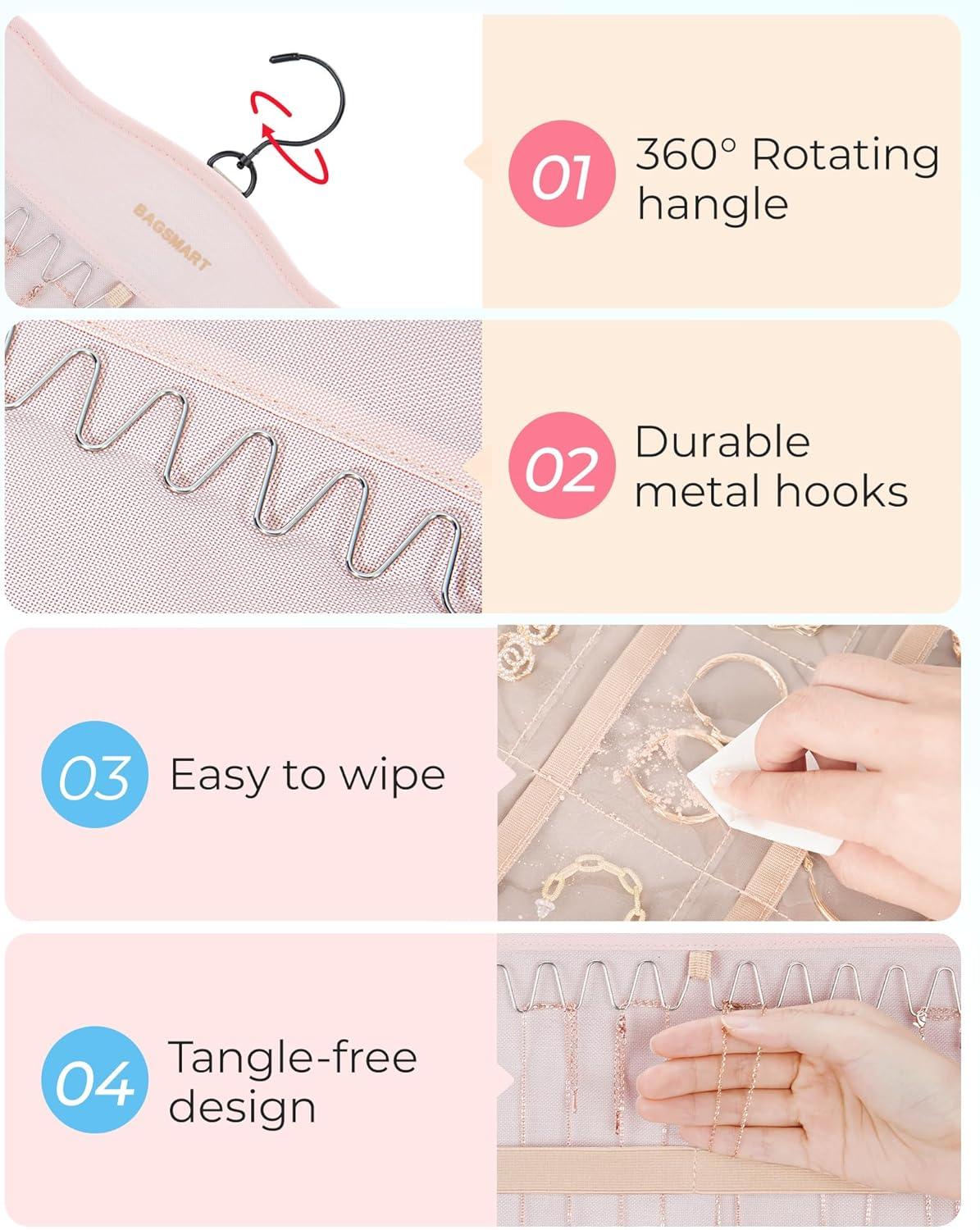 Perfect organizational partner- Crafted from durable polyester, PVC materials, and featuring strong metal hooks, our jewelry holder organizer is built to last. Its exquisite design is further enhanced by the leather logo. The two-sided design, along with the 360-degree rotating hanger, allows for easy rotation in any direction and effortless hanging on a closet, door, or wall. It takes up minimal space, equivalent to that of a single item of clothing in your closet.