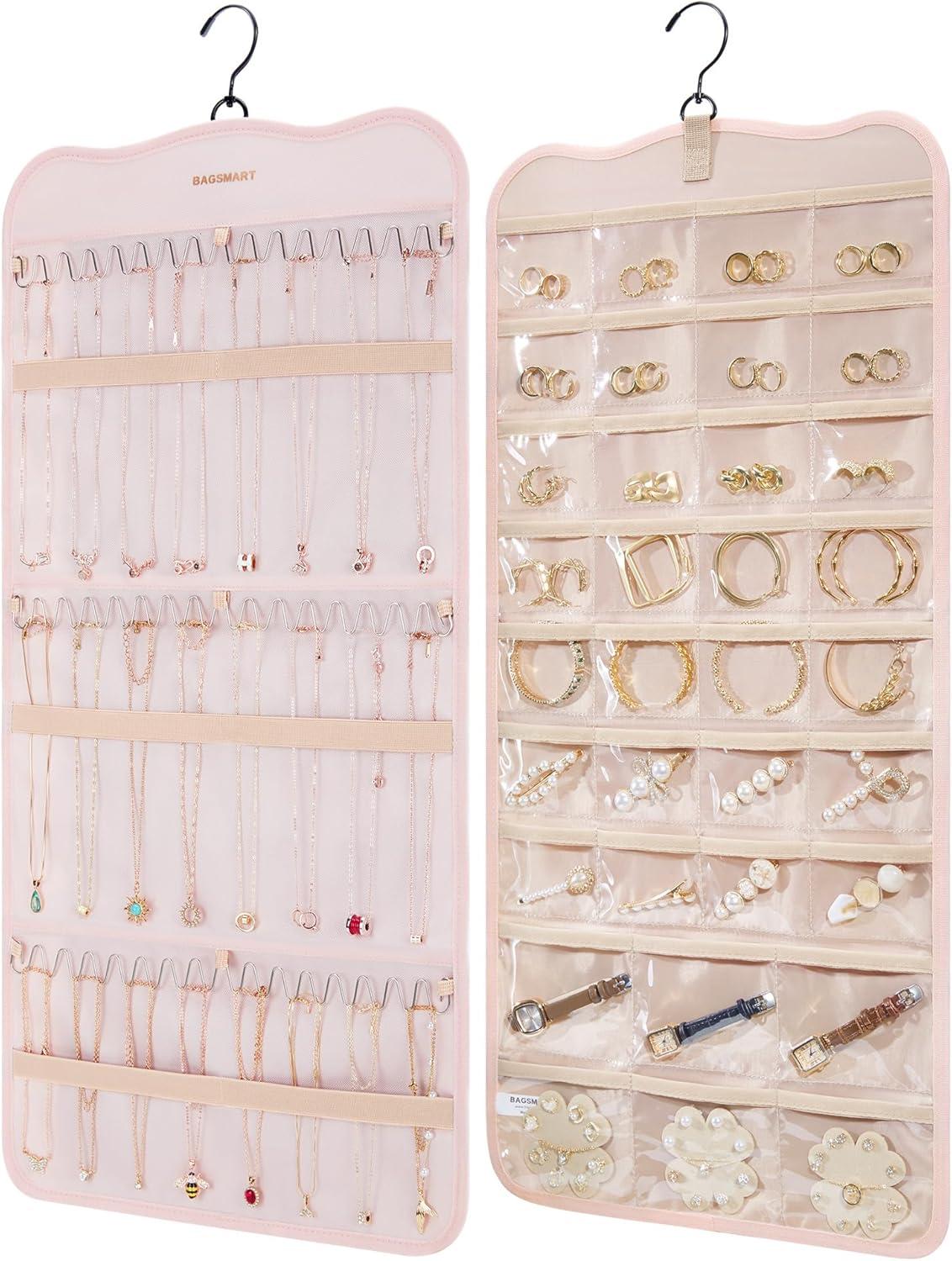 BAGSMART Hanging Jewelry Organizer Storage with Hanger Metal Hooks Double-Sided Jewelry Holder for Earrings, Necklaces, Rings on Closet, Wall, Door, 1 piece Large Black(Pink)