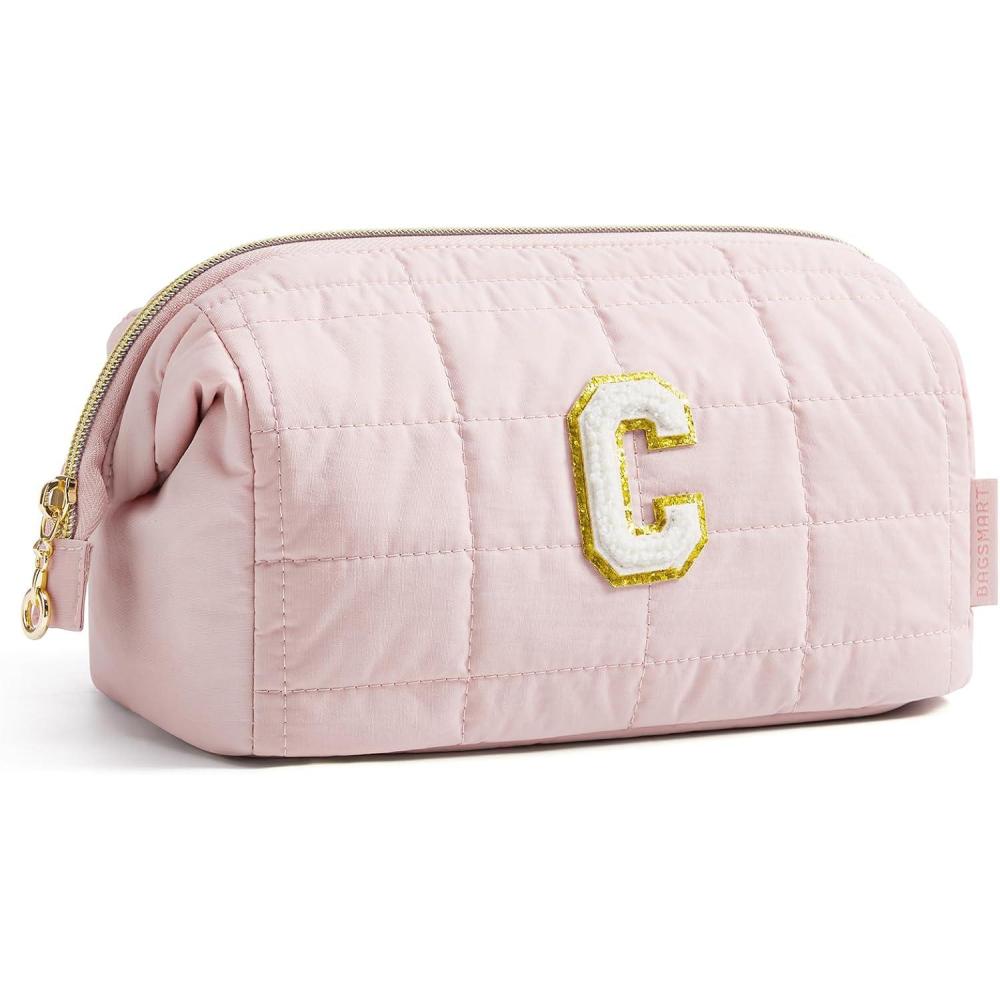 BAGSMART Makeup Bag Travel Toiletry Bag, Puffy Padded Make Up Bags for Women Makeup Organizer Case, Wide-open Pouch Purse Travel Essentials Toiletries Accessories Brushes, Pink(25-Letter C)