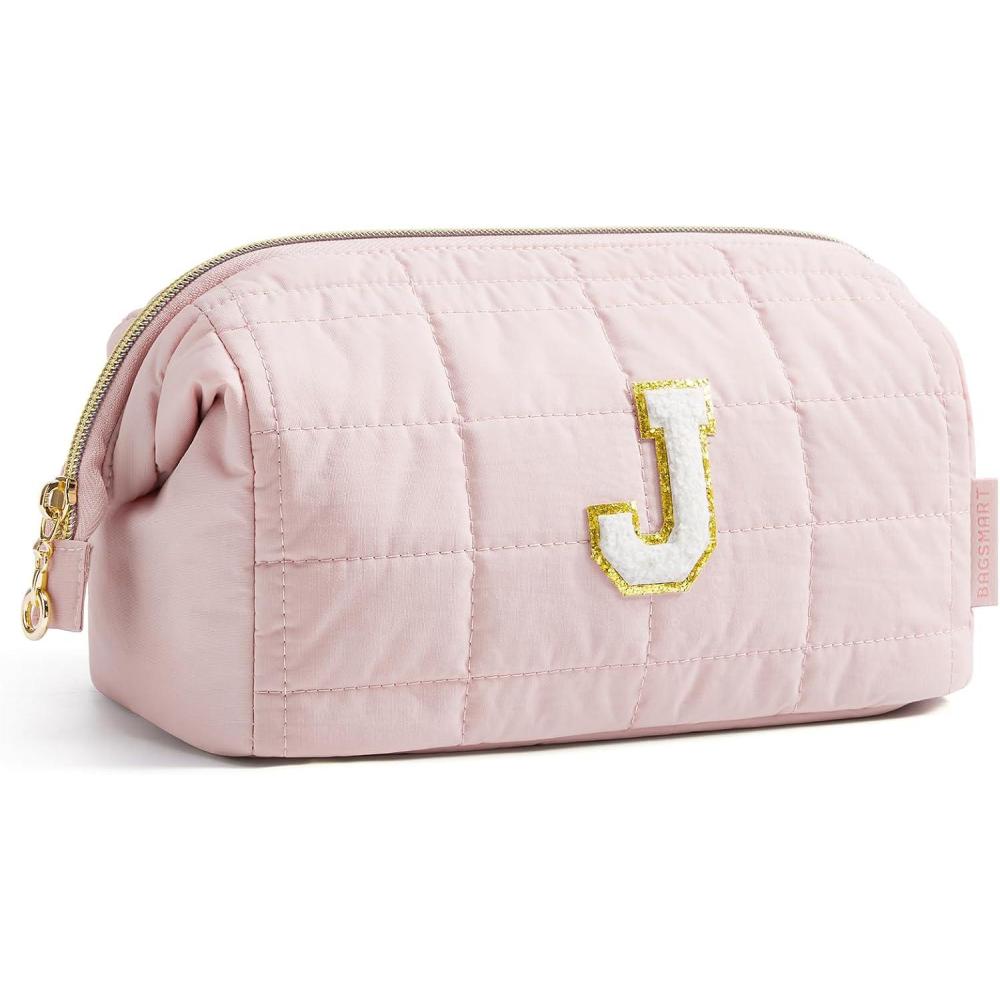 BAGSMART Makeup Bag Travel Toiletry Bag, Puffy Padded Make Up Bags for Women Makeup Organizer Case, Wide-open Pouch Purse Travel Essentials Toiletries Accessories Brushes, Pink(27-Letter J)