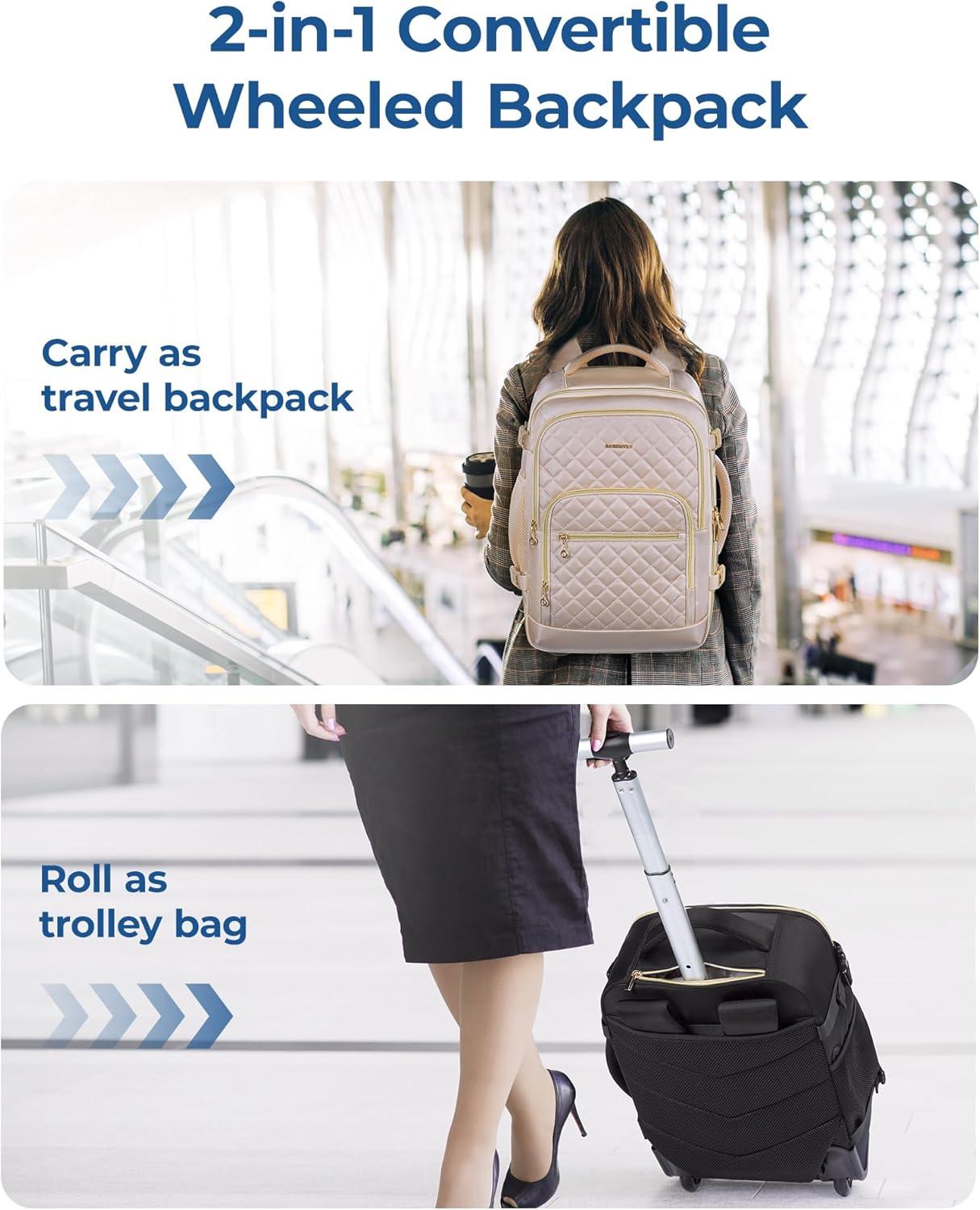 Travel-Friendly: As an airline-approved carry-on size, this rolling backpack for women can easily fit in the overhead compartment of airplanes with dimensions of 19.5 x 8.4 x 12.5 inches. It can unfold 180 degrees, making it convenient for security checks. With double zippers, your belongings are protected during travel.