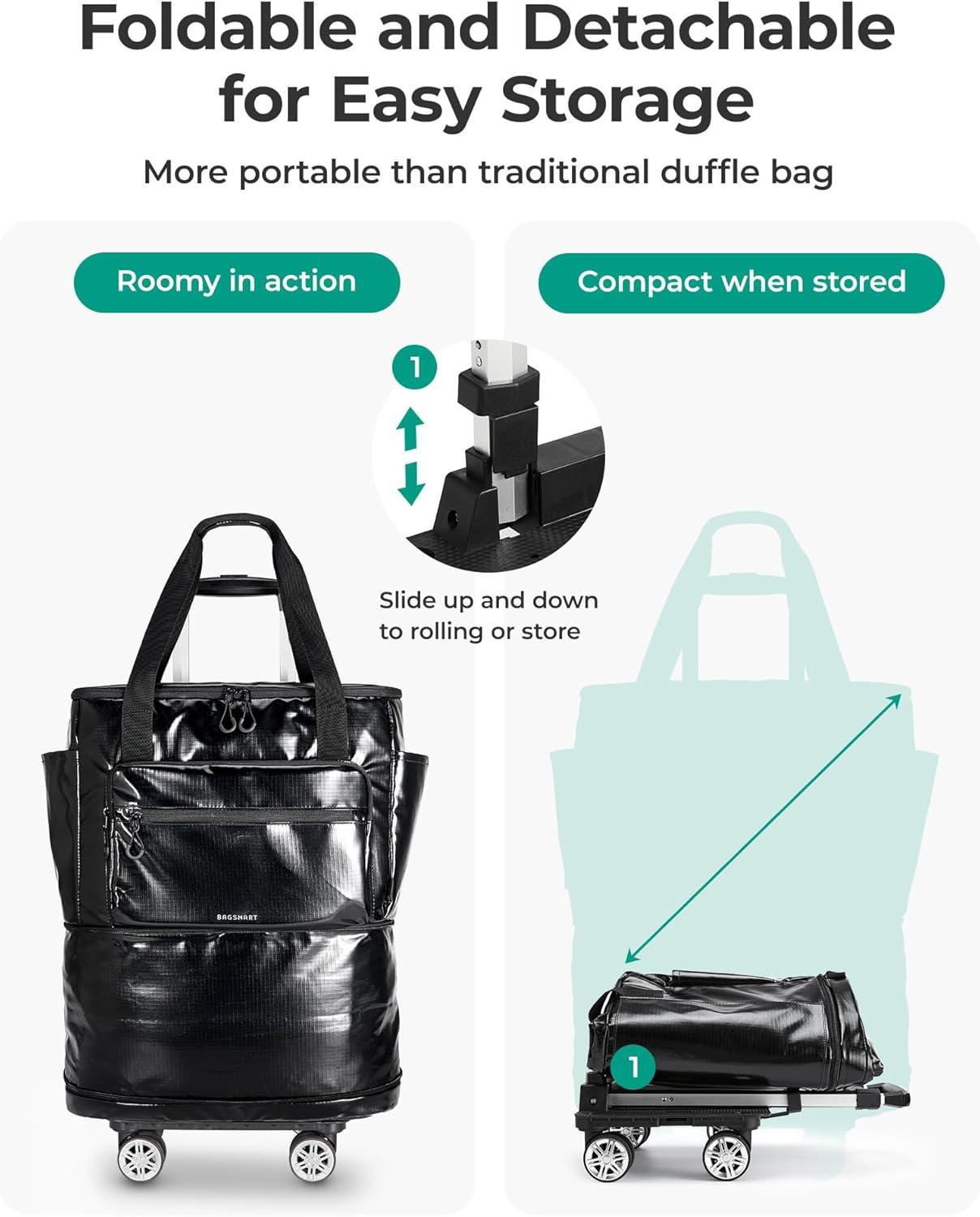 Airline Approved: Bagsmart rolling duffle bag is your worry-free companion for seamless boarding, divided into two sizes: Personal-item size in normal status, fits underseat and Carry-on size in expanded status, fits overhead bin