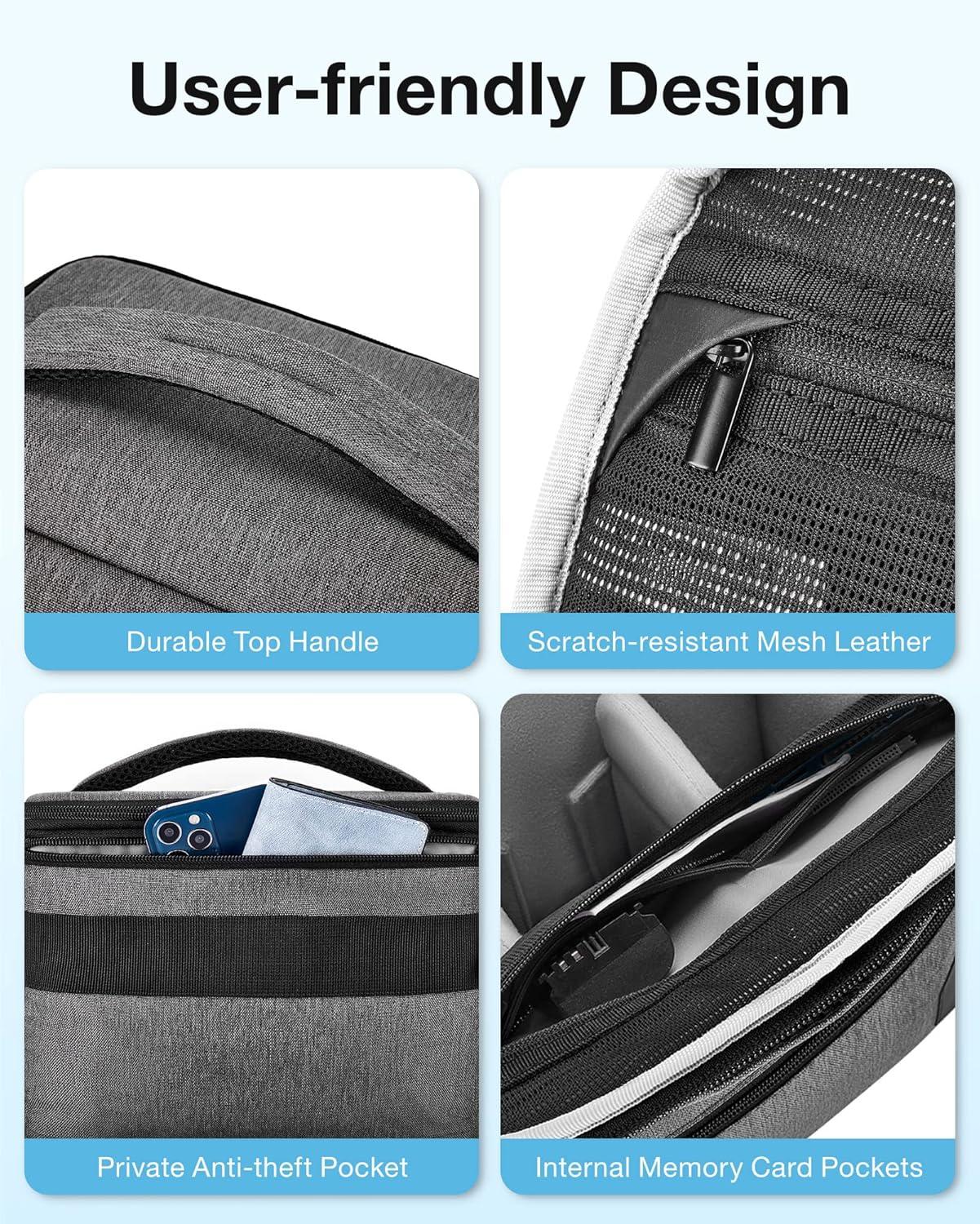 User Friendly: Travel and transport your gear in style. External Size is 9.8×5.1×7.9 inch, making it a compact camera bag that offers a convenient hands-free way to carry your camera and essentials that is ideal for travelling and commuting