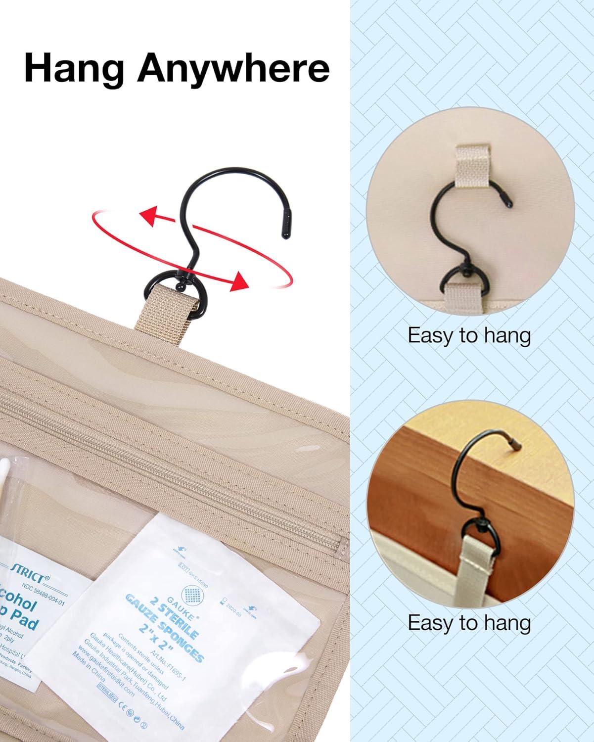 Convenient Design: Stow-away 360-degree swivel non-slip metal hook for versatile hanging options; carry handle doubles as its hanging strap; two-way zipper closure for quick access