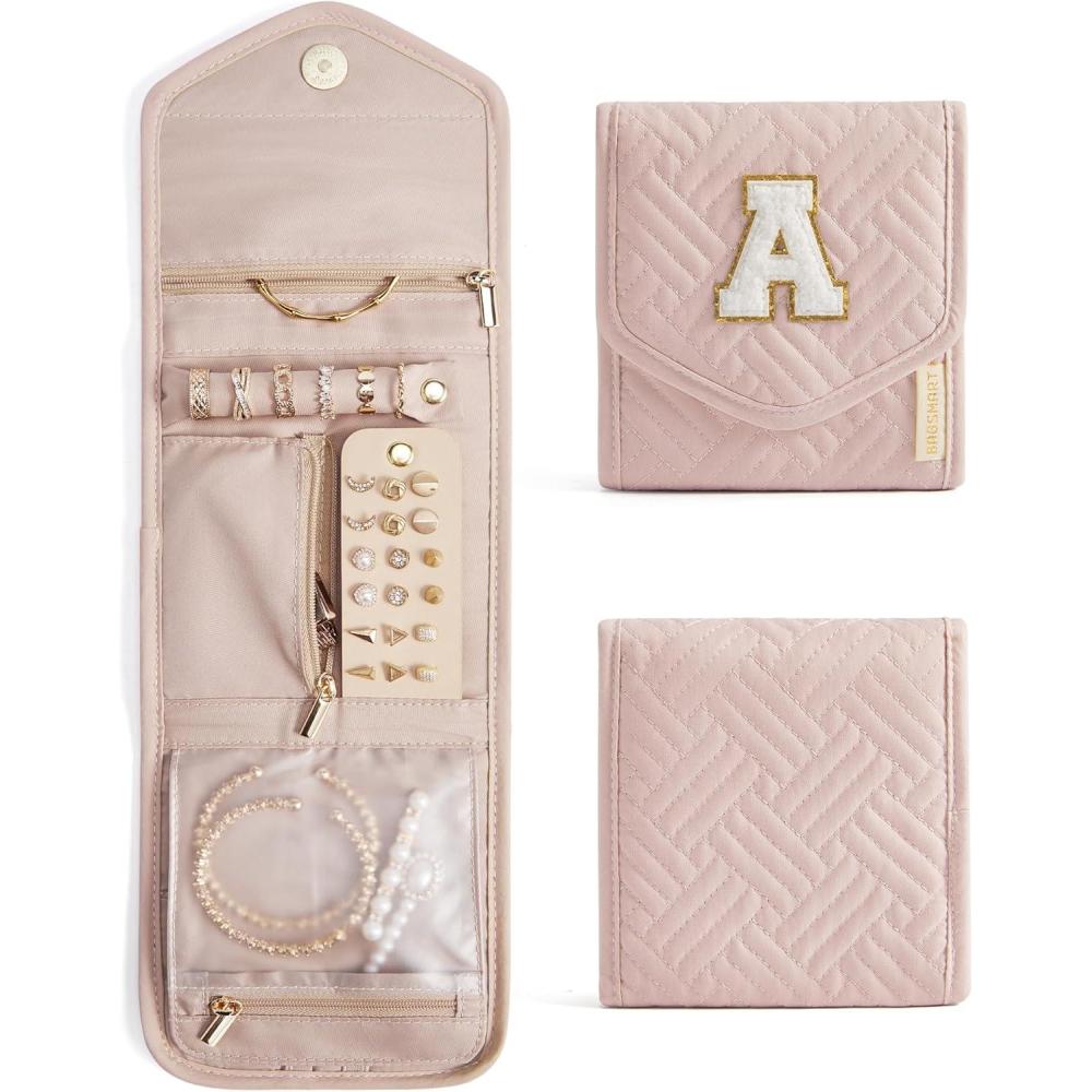 BAGSMART Travel Jewelry Organizer Case Foldable Small Jewelry Roll for Journey Rings, Necklaces, Earrings, Bracelets,Mini,Soft Pink(PInk-A)