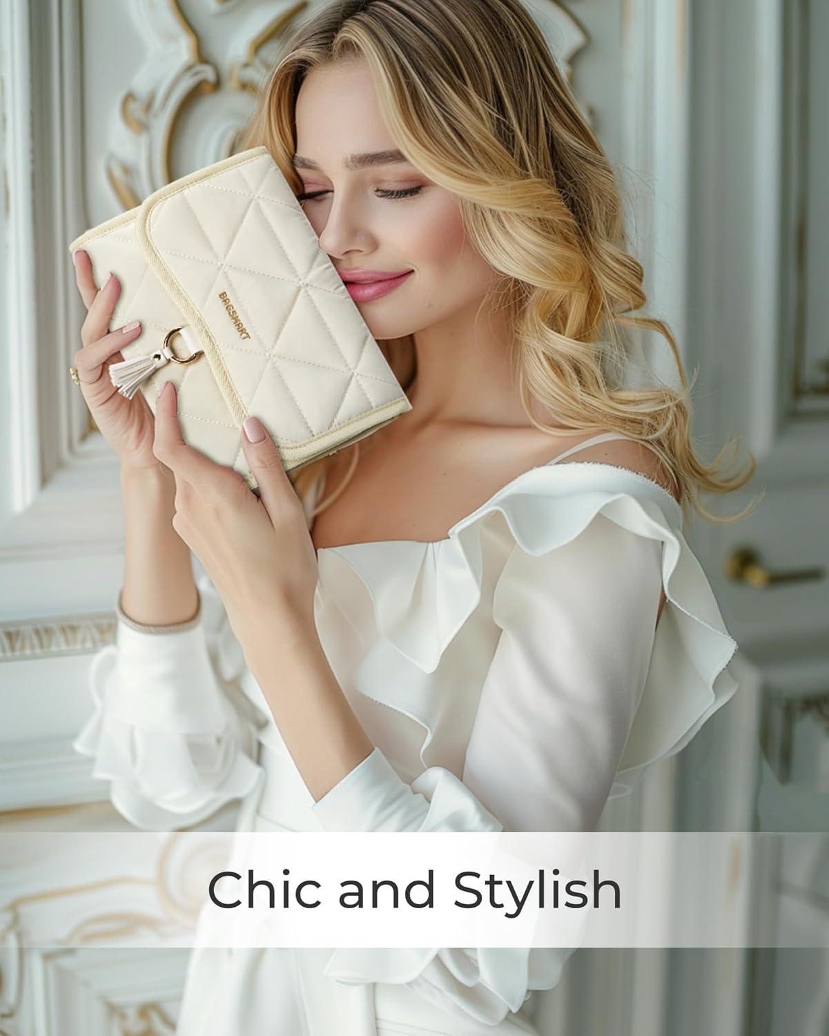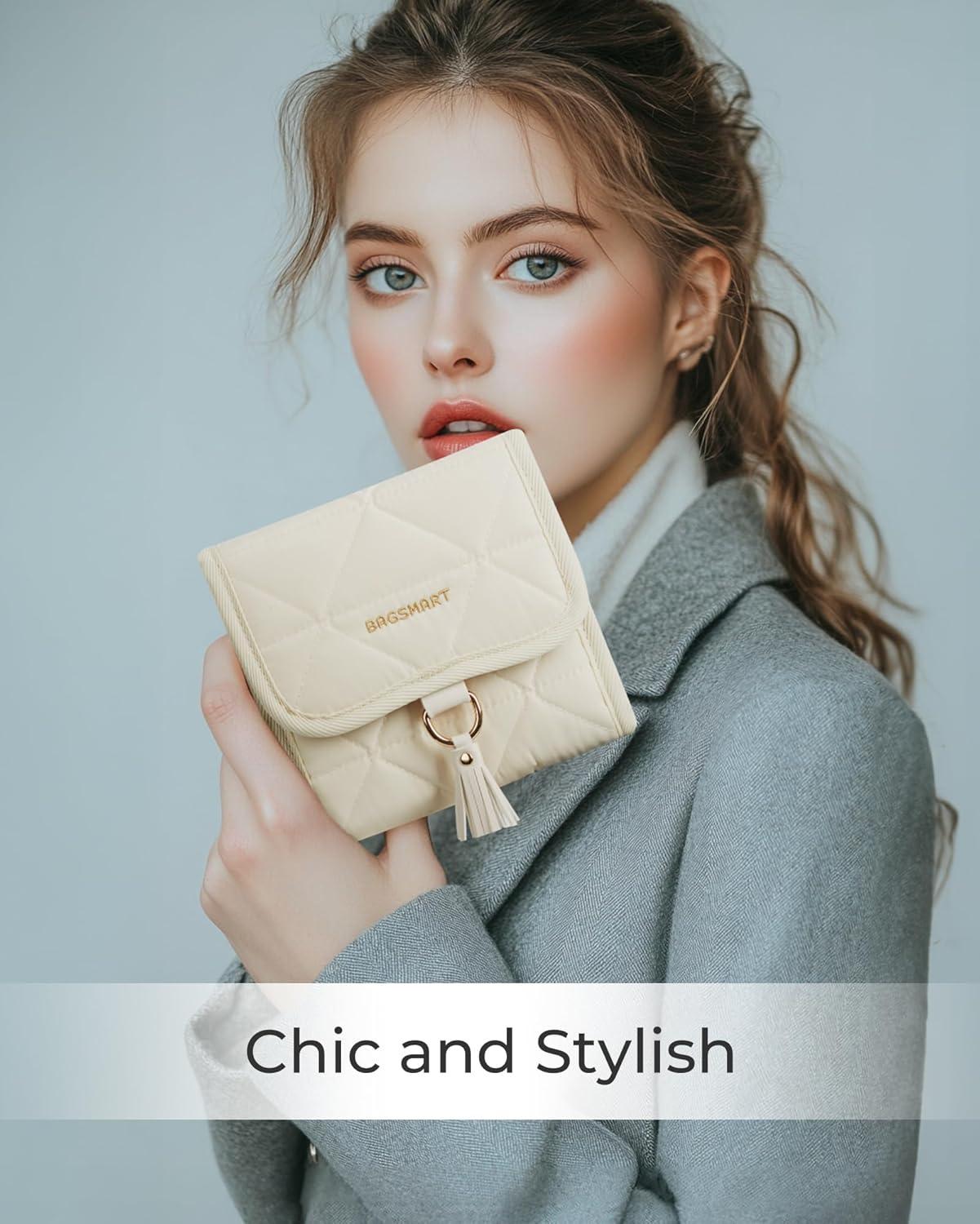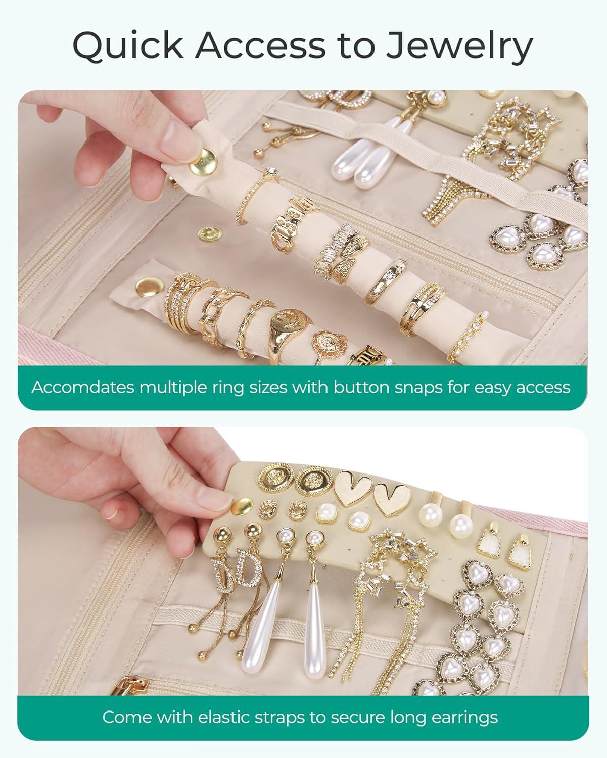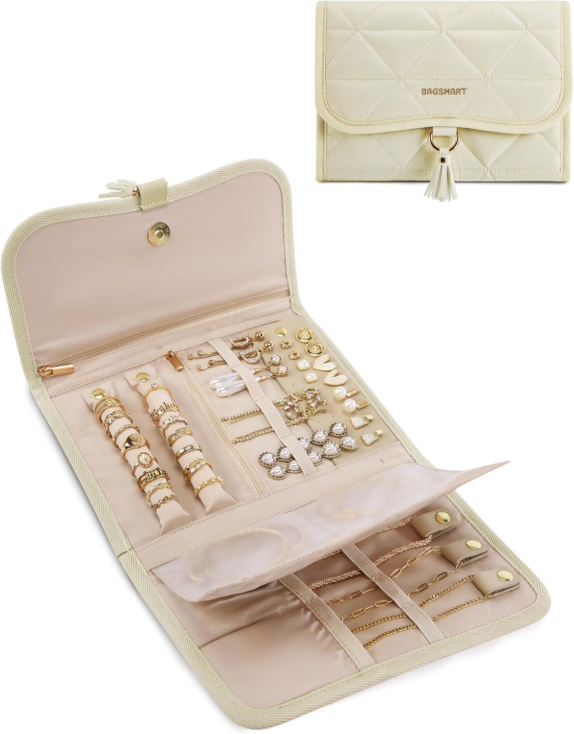 BAGSMART Travel Jewelry Organizer for Women, Foldable Jewelry Storage Roll for Earrings, Necklaces, Bracelets, Earrings, Brooches, Fashion Black(Beige)