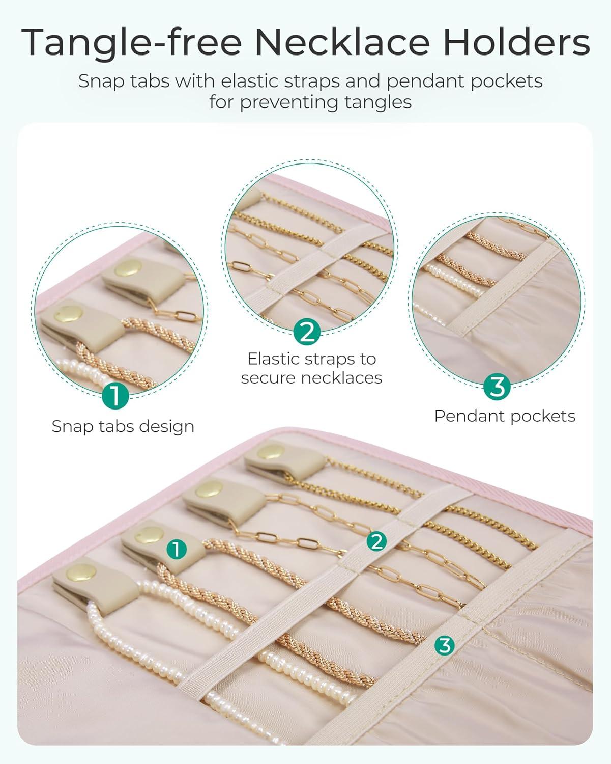 Tangle-Free Design: The necklace compartment features elastic straps and leather fasteners, along with elastic pockets that securely hold your necklaces, preventing any tangles. Plus, the earring board has elastic straps to keep longer earrings safely in place, avoiding knots.