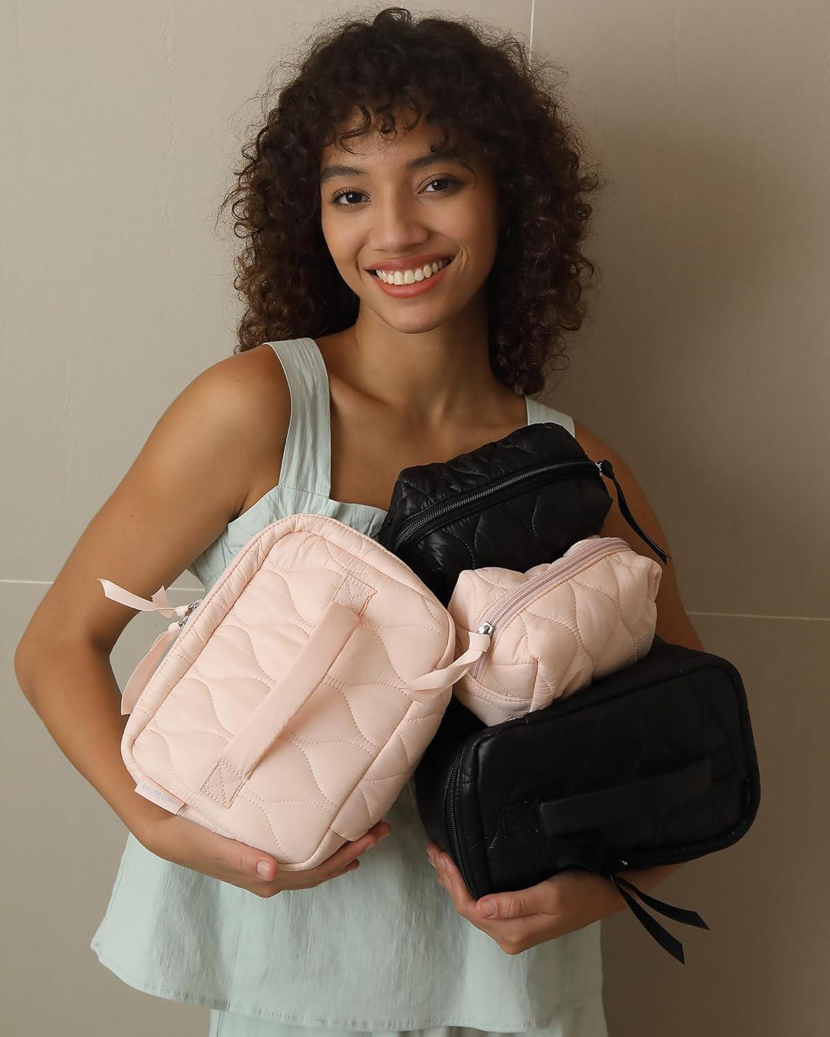 【Travel-Friendly】 With a stylish appearance, water-resistant quilted fabric, sturdy zippers, and comfy padded handle, The portable cosmetic travel makeup bag with dividers is a must-have for travel. It serves as a travel essentials bag, makeup bag, electronic organizer, and daily item organizer.