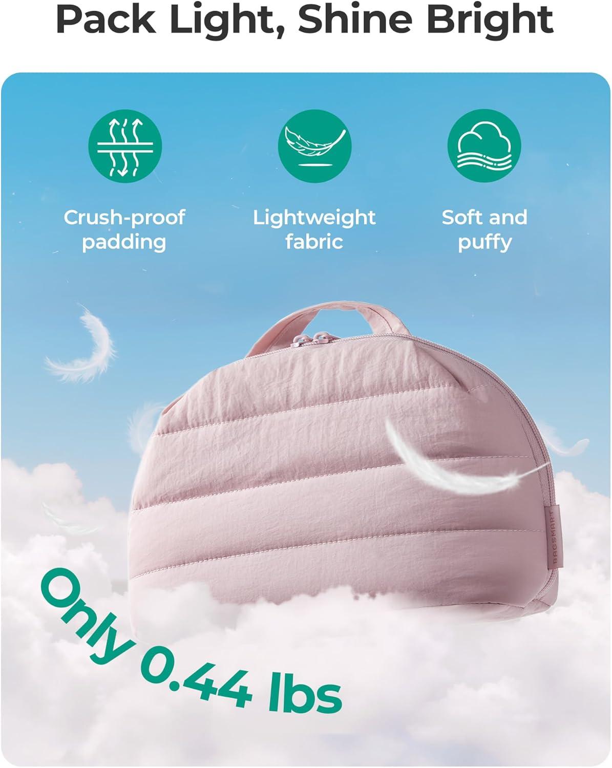 BAGSMART Travel Makeup Bag for Women, Portable Fold-down Cosmetic Case, Puffy Padded Make Up Organizer Pouch, Water-resistant Toiletry Bag for Toiletries, Brushes (Baby Pink)(Dark Pink)