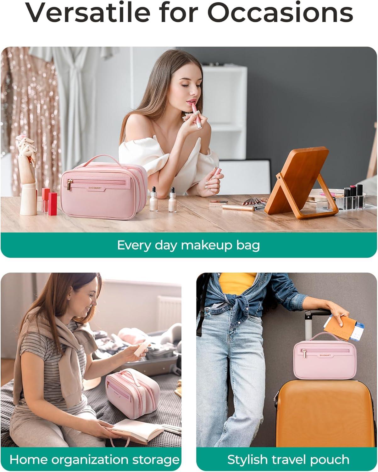 【Premium Quality】This BAGSMART cosmetic bag is made of water-resistant polyester for excellent durability and protection. This make up bag features custom metal zippers that ensure smooth operation, and a sturdy leather top handle that makes it easy to carry. Its well-organized interior, combined with its fashionable design and portability, make it an ideal choice for a stylish and convenient makeup bag.