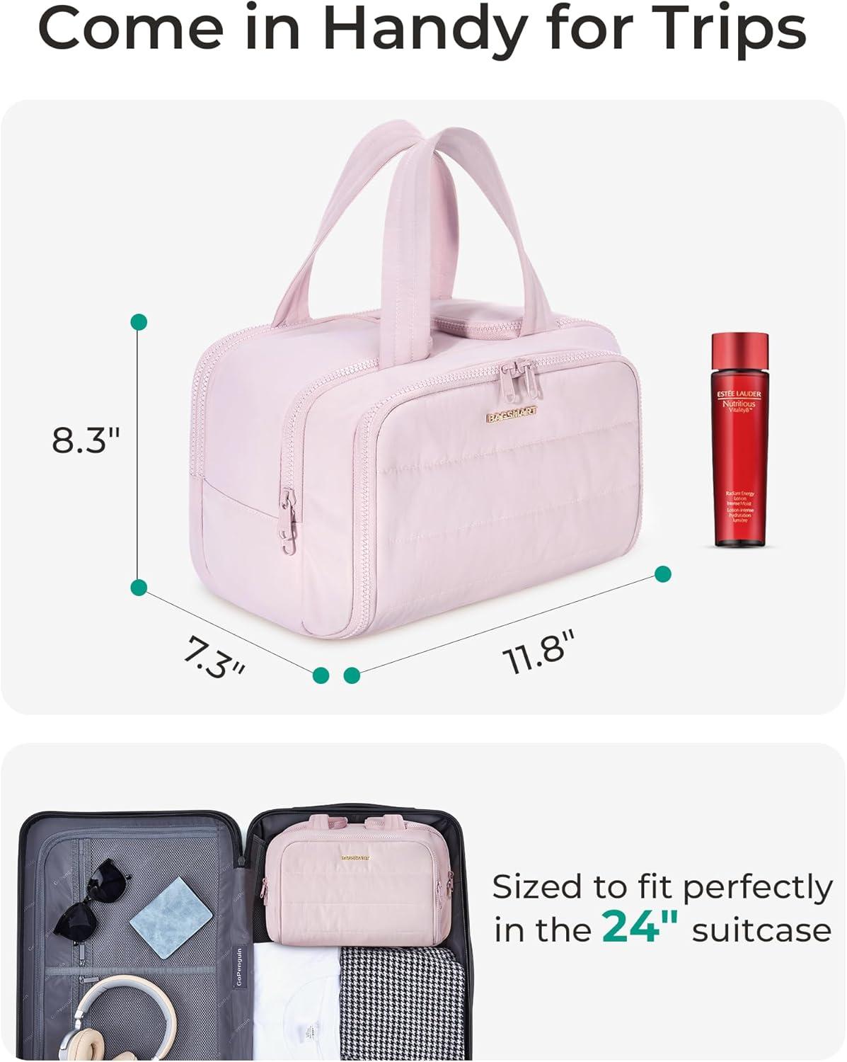 BAGSMART Travel Toiletry Bag, Crush Toiletry Bag for Women, Wide-open Puffy Toiletry Bags for Traveling, Large Travel Cosmetic Makeup Bag Organizer for Accessories,Toiletrie, Blue(d-Pink)