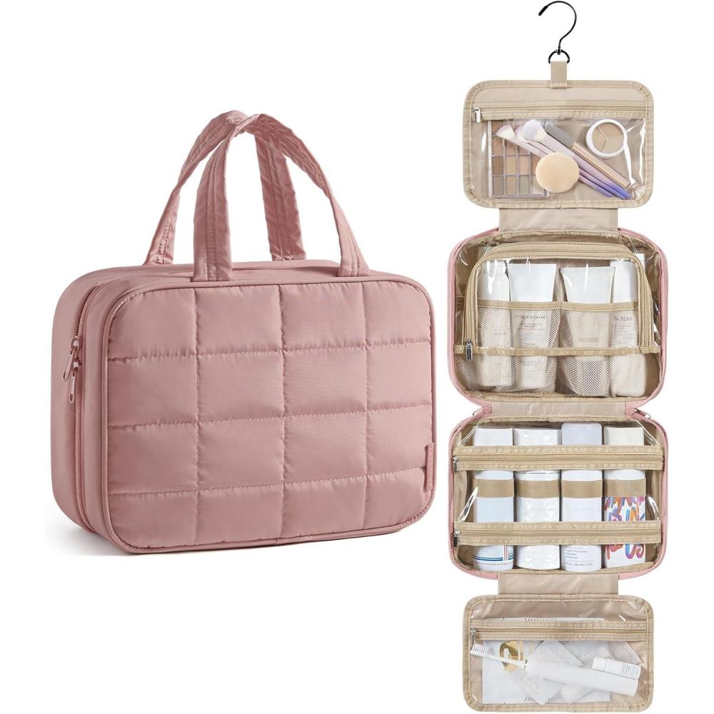 BAGSMART Travel Toiletry Bag for Women, Hanging Travel Bag for Toiletries, Puffy Makeup Cosmetic Bag Organizer, Carry-on Travel Accessories Essentials, Camel(Dark Pink)
