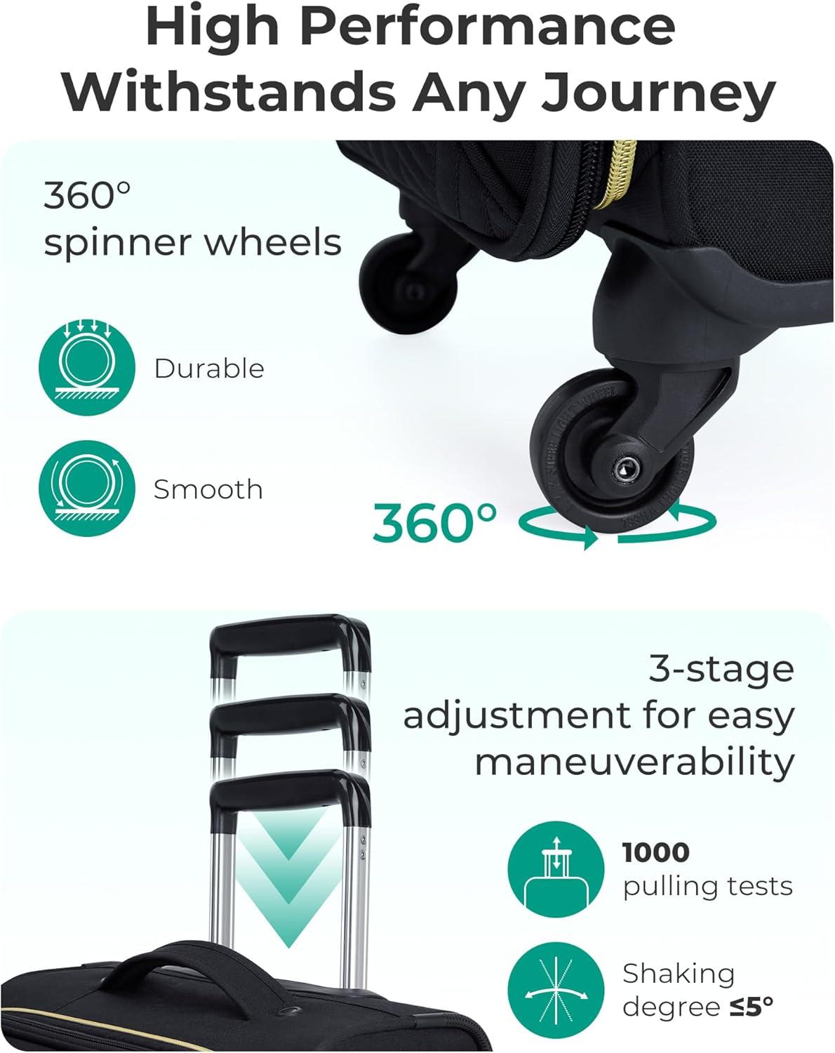 Easy to Maneuver: Featuring 360° spinner wheels, this under seat suitcase guarantees smooth gliding on any surface, even when fully packed, ensuring mobility. The extension handle ensures seamless and long-lasting. 2-step ergonomic high-grade aluminum tube handle can adjust to multiple heights while minimizing wobble, which offers easy mobility. Additionally, sturdy top and side handles offer convenient lifting and carrying options for effortless maneuvering