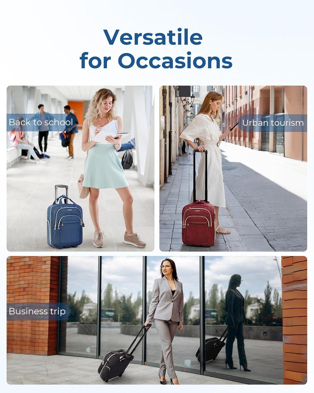 Secure Design:Small underseat carry on luggage with wheels featuring lockable zippe on both the main and laptop compartments, come with a security lock to ensure your belongings are safe. The initial combination for lock is 0-0-0. Made from premium quilted polyester, this carry-on luggage resists stains and abrasions, with durable zippers for reliability