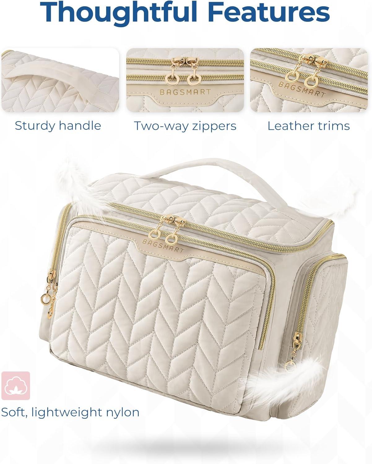 BAGSMART Travel Makeup Bag, Cosmetic Bag Make Up Organizer Case,Large Wide-open Pouch for Women Purse for Toiletries Accessories Brushes(D-1 Layer- Beige)