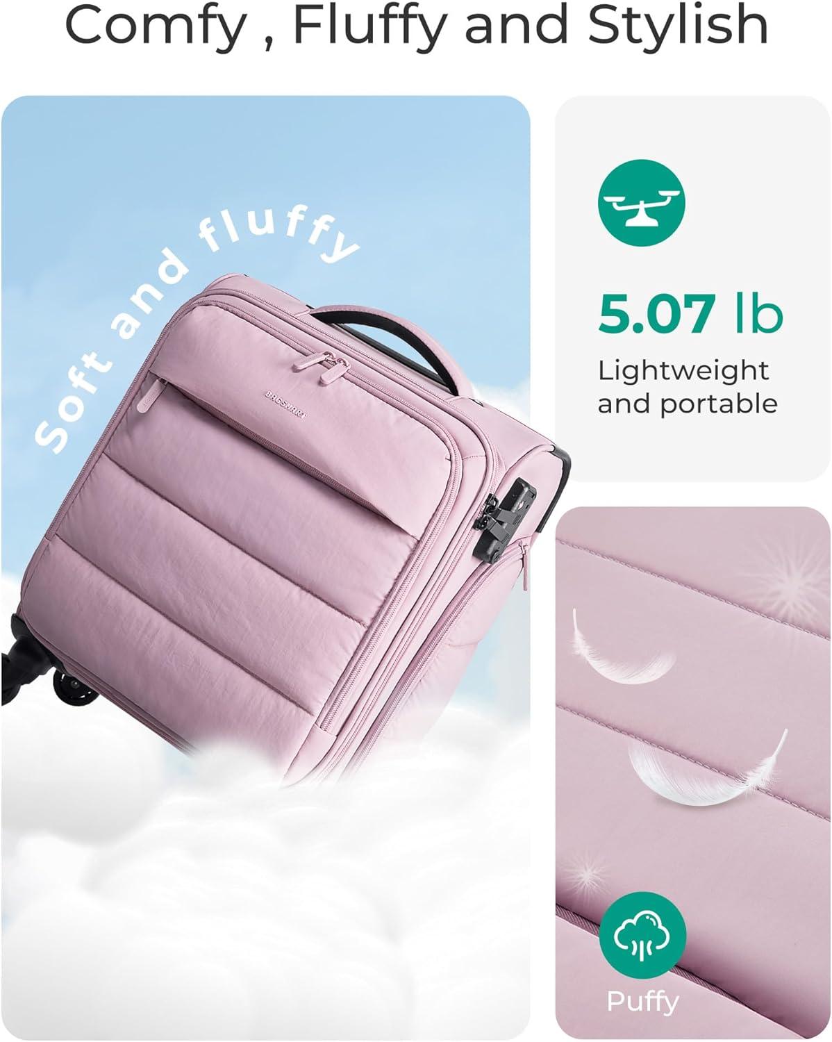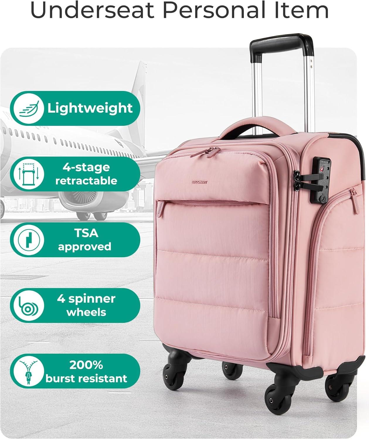 • BAGSMART Underseat Carry on Luggage with Wheels, Soft Underseat Travel Luggage with PVC Wet/Dry Pockets, Lightweight Soft Personal Item Suitcase for Short Trip, Pinkish Purple(Sakura Pink)