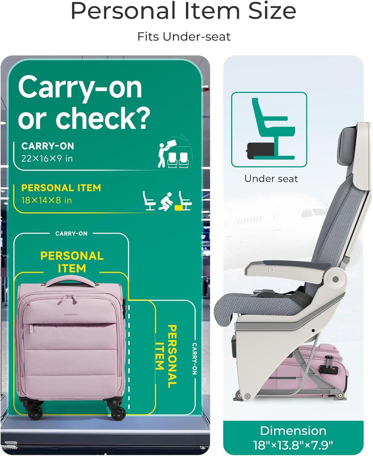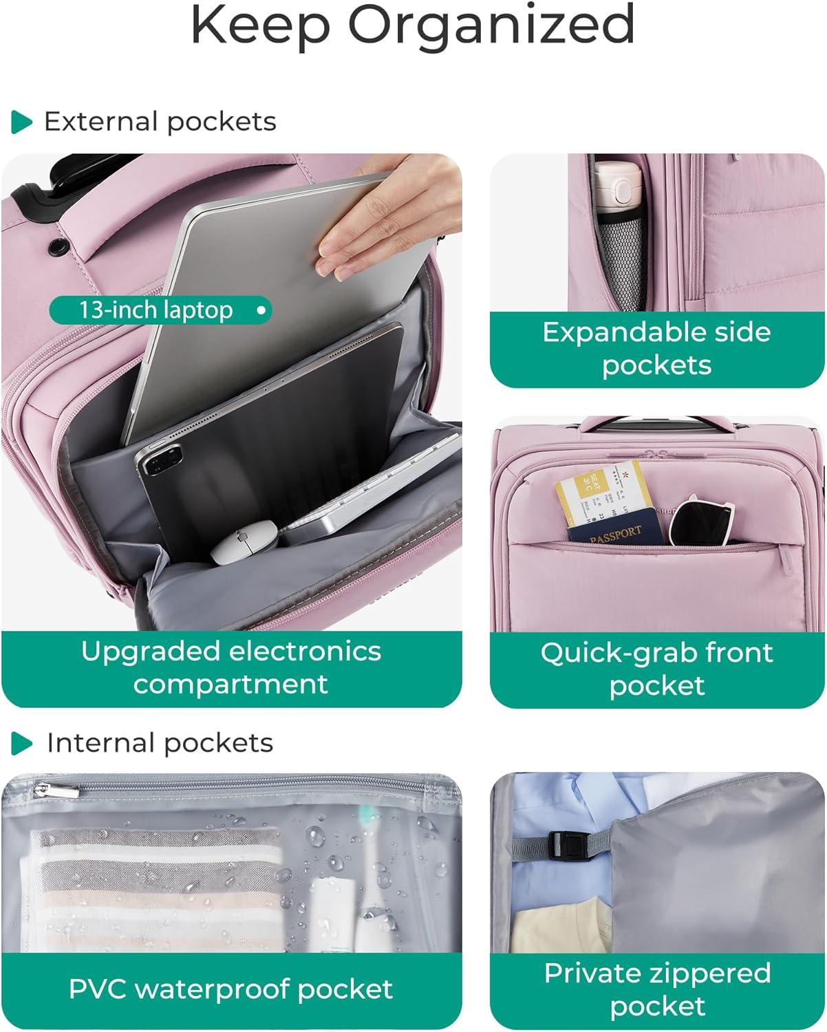 • BAGSMART Underseat Carry on Luggage with Wheels, Soft Underseat Travel Luggage with PVC Wet/Dry Pockets, Lightweight Soft Personal Item Suitcase for Short Trip, Pinkish Purple(Purple)